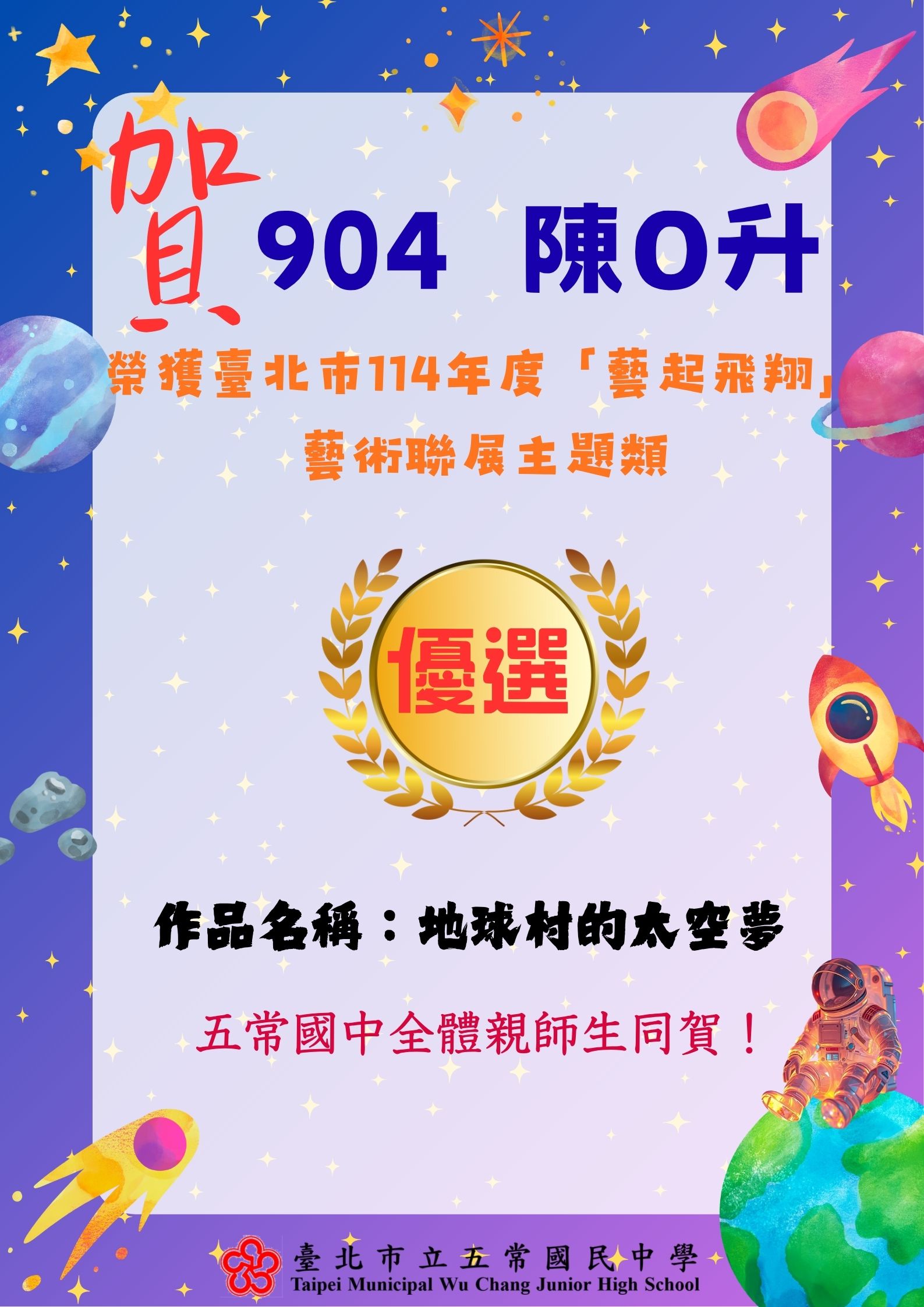 恭喜904陳O升同學榮獲「臺北巿114年度「藝起飛翔」藝術聯展主題類」【優選】!!五常國中全體親師生同賀!!