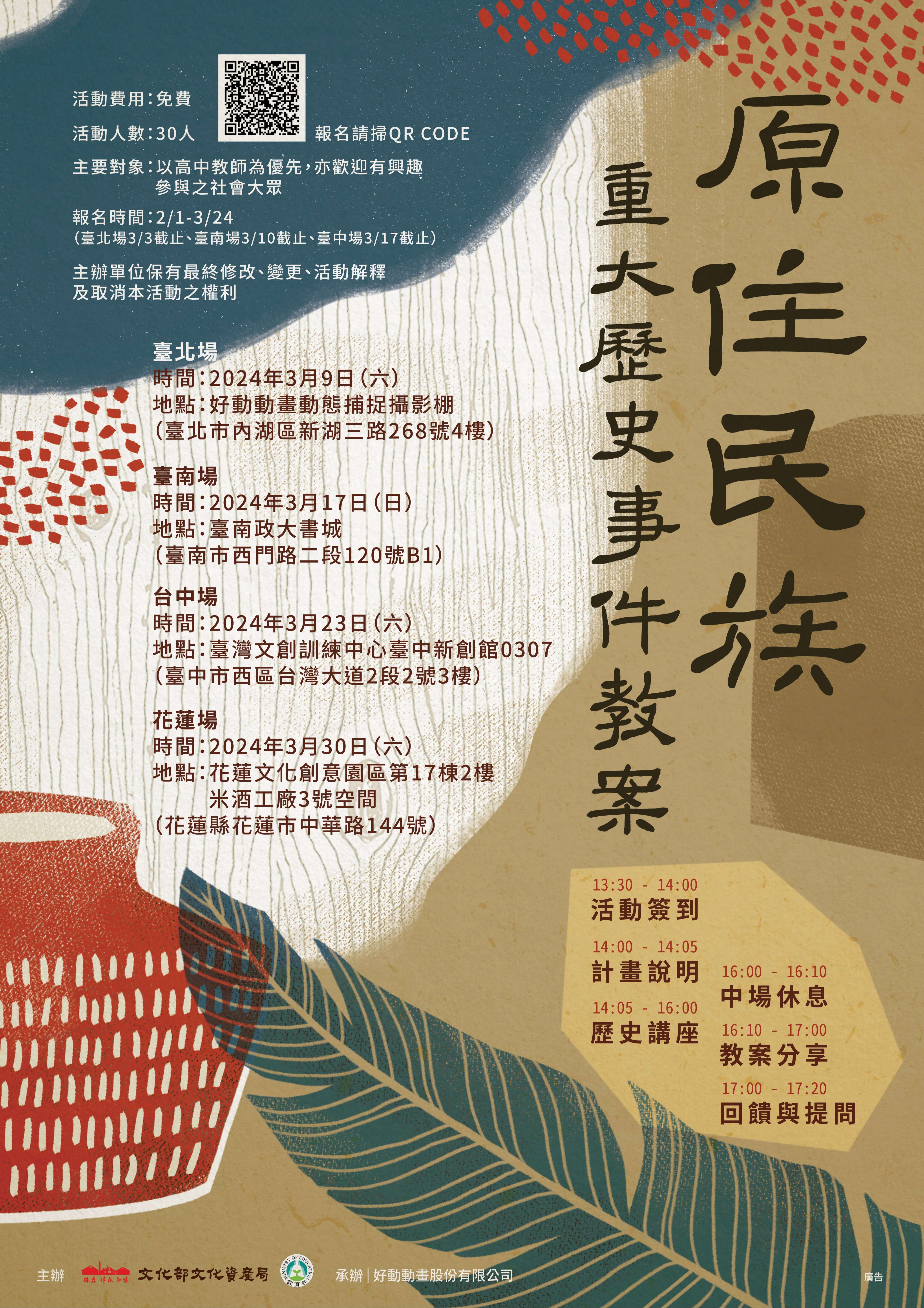 主旨:文化部文化資產局委託好動動畫股份有限公司辦理 「原住民族重大歷史事件教案工作坊」報名資訊,請各校 鼓勵教師踴躍報名參加,請查照。