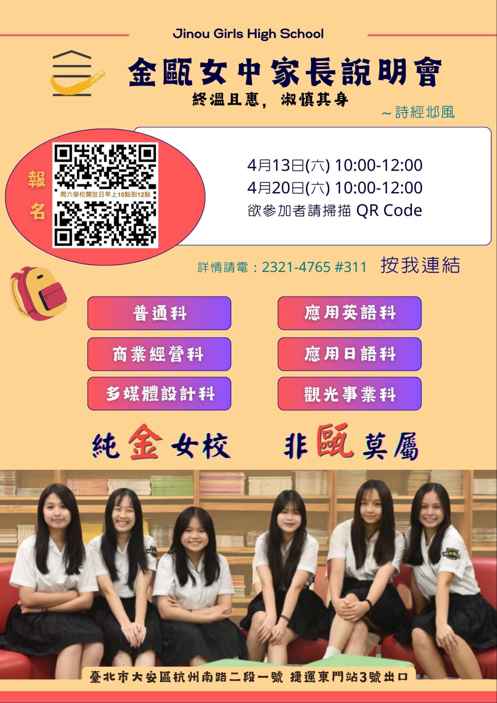 二、報名方式:即日起至113年4月19日(星期五)止,請逕至金甌女中首頁(網址:https://www.cogsh.tp.edu.tw/home) 或直接至Googleq表單(網址:https://forms.gle/EPBVKaAMf1hcdneRA)報名參加。