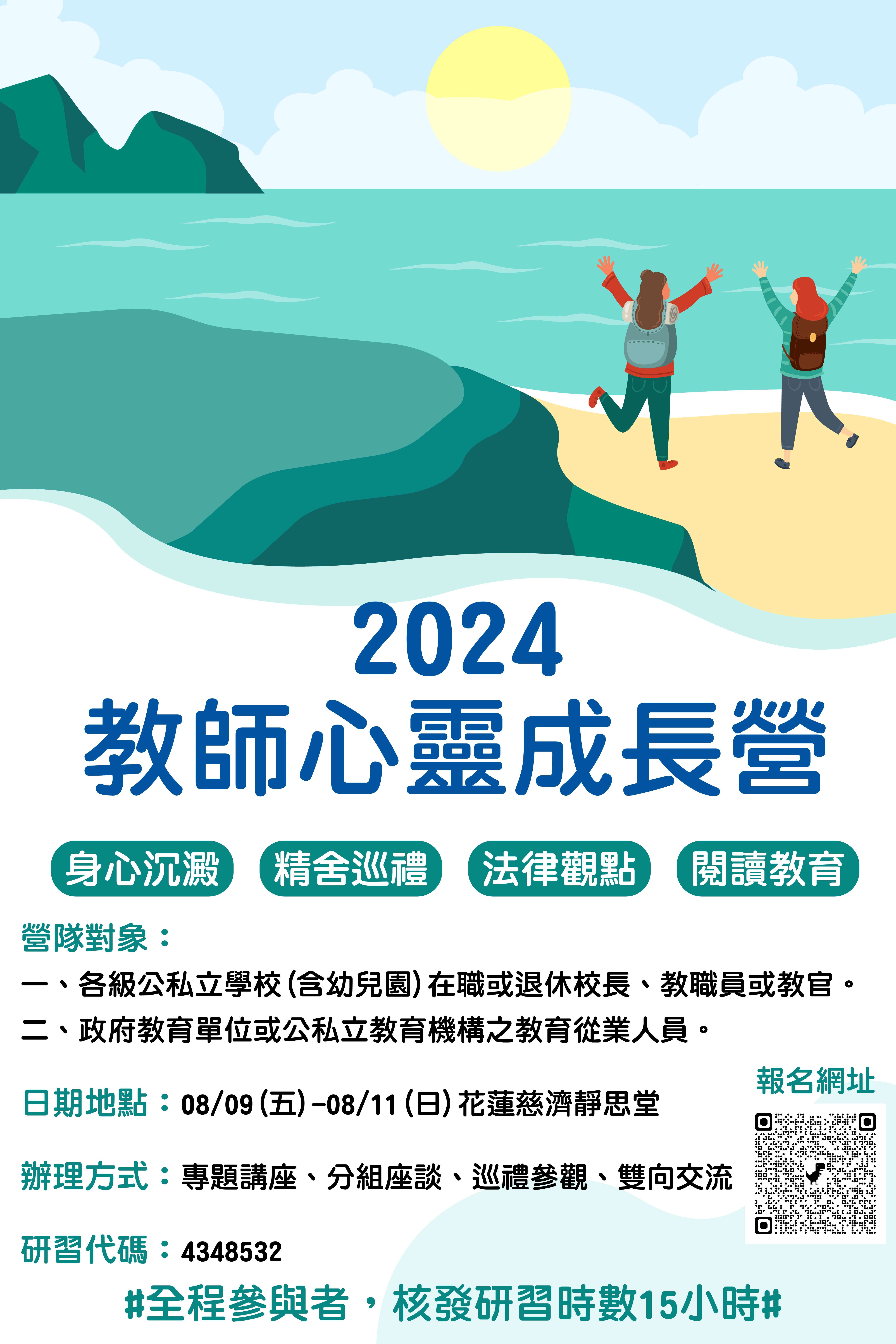 二、活動資訊: (一)活動時間:113年8月9日(星期五)至8月11日(星期日), 三天兩夜,全程住宿。 (二)活動地點:花蓮慈濟靜思堂(花蓮市中央路3段703 號)。 (三)營隊對象: 1、各級公私立學校(含立案幼兒園)在職或退休校長、教 職員或教官。 2、政府教育單位或公私立教育機構之教育從業人員。 (四)報名時間:即日起至7月20日止或額滿為止(限額150 名,依報名先後順序錄取)。(五)報名方式:採網路報名,網址: https://forms. office.com/r/WyLamzPb0W 。 (六)全程參與者核予15小時研習時數,全國教師在職進修網 課程代碼:4348532。
