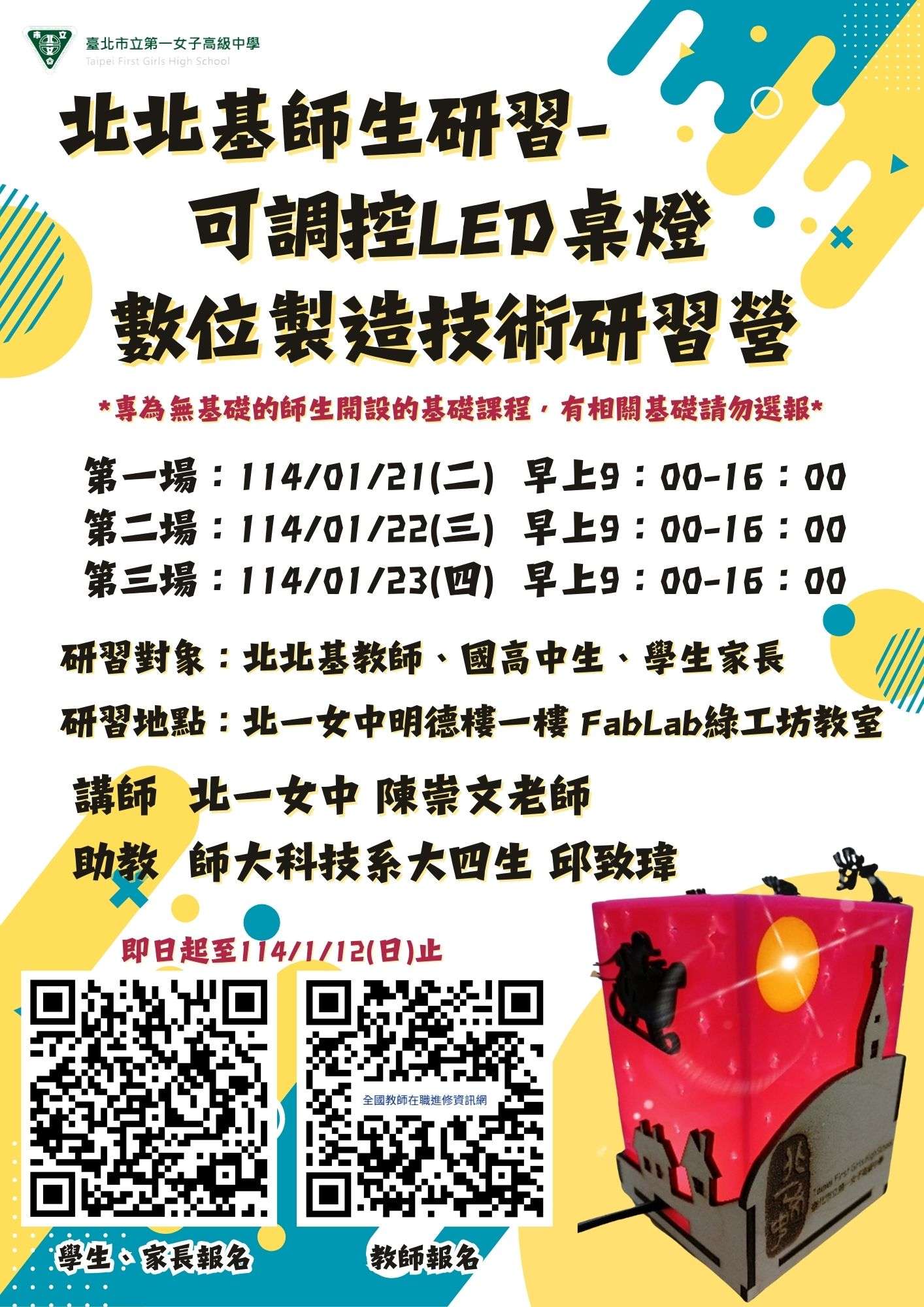 一、研習主題:北北基師生研習—可調控LED桌燈數位製造技術