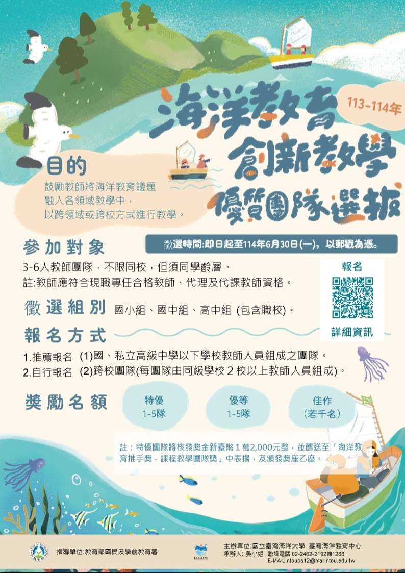說明: 一、依據國立臺灣海洋大學114年2月7日海洋教育字第 1140002222號函及本局113年5月20日北市教國字第 1133063380號函續辦。 二、為培育具備海洋素養的人才,並推動海洋相關政策,教育 部自108年起辦理旨揭選拔活動,鼓勵高級中學以下學校教 師將海洋相關議題融入課程中,透過多元化教學方式在課 堂上呈現,協助學生建立海洋知識,增進對海洋議題的理 解與關注,進而提升其海洋素養,為我國未來永續發展奠 定基礎。 三、前揭實施計畫重點及本局所屬各級學校報名期限說明如 下: (一)對象:1、教師符合現職專任合格教師、代理及代課教師資格。 2、全國公私立高級中等下學校,每校以1團隊為限,每1 團隊應由3位(含)以上教師組成(至多不超過6 位)。 (二)組別:分為國小組、國中組、高中組共3組分別進行評 選。 (三)報名方式:由本局依國小組、國中組、高中組,各組分 別推薦1至10個團隊。 (四)貴校倘有意願報名,請於114年4月30日(星期三)前檢 具報名表及相關文件紙本、電子光碟,免備文逕送本局 承辦人,以利審核後再薦送至主辦單位。 四、國教署管轄之國私立高級中等學校、國立學校附設國民中 小學之教師團隊,可依計畫報名期限逕自掛號郵寄報名表 報名(各校限1隊),跨校團隊一律採自行報名(每團隊由 同級學校2校以上組成)。 五、本案如有相關問題,請逕洽國立臺灣海洋大學臺灣海洋教 育中心吳小姐,聯絡電話:(02)2462-2192分機1288。 六、檢送實施計畫及宣傳海報各1份,報名表及相關文件下載連 結:https://reurl.cc/8vGGmd。