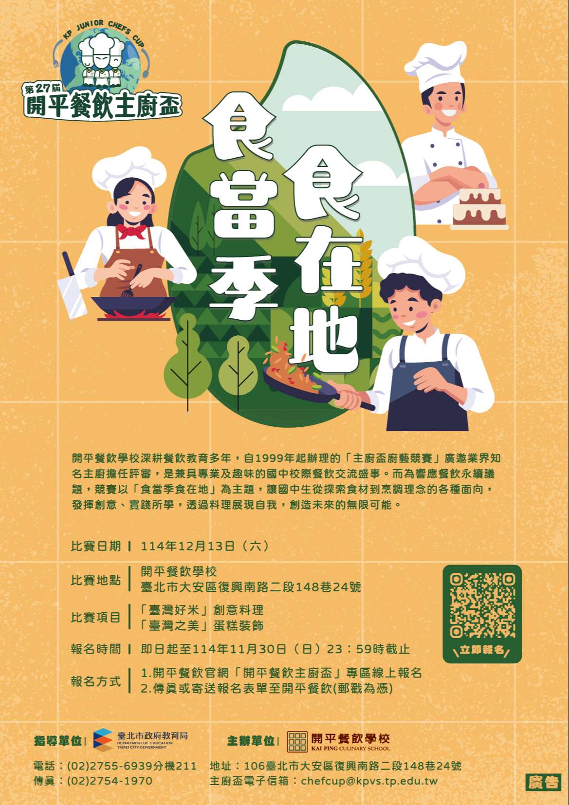一、開平餐飲學校長年致力於推展餐飲專業教育,啟蒙對餐飲 有興趣的學生,讓餐飲文化能向下紮根。自西元1999年 起,由開平餐飲師生共同舉辦的「主廚盃餐飲競賽」,已成為國中校際餐飲交流的年度盛事。本次主題是「食當季 食在地」,旨在響應現代社會對永續發展和健康生活的追求,希望透過此次活動,讓孩子們開始探索食材選擇到烹 調理念的各種面向,並發揮創意實踐所學,透過料理展現自我,創造未來的無限可能。