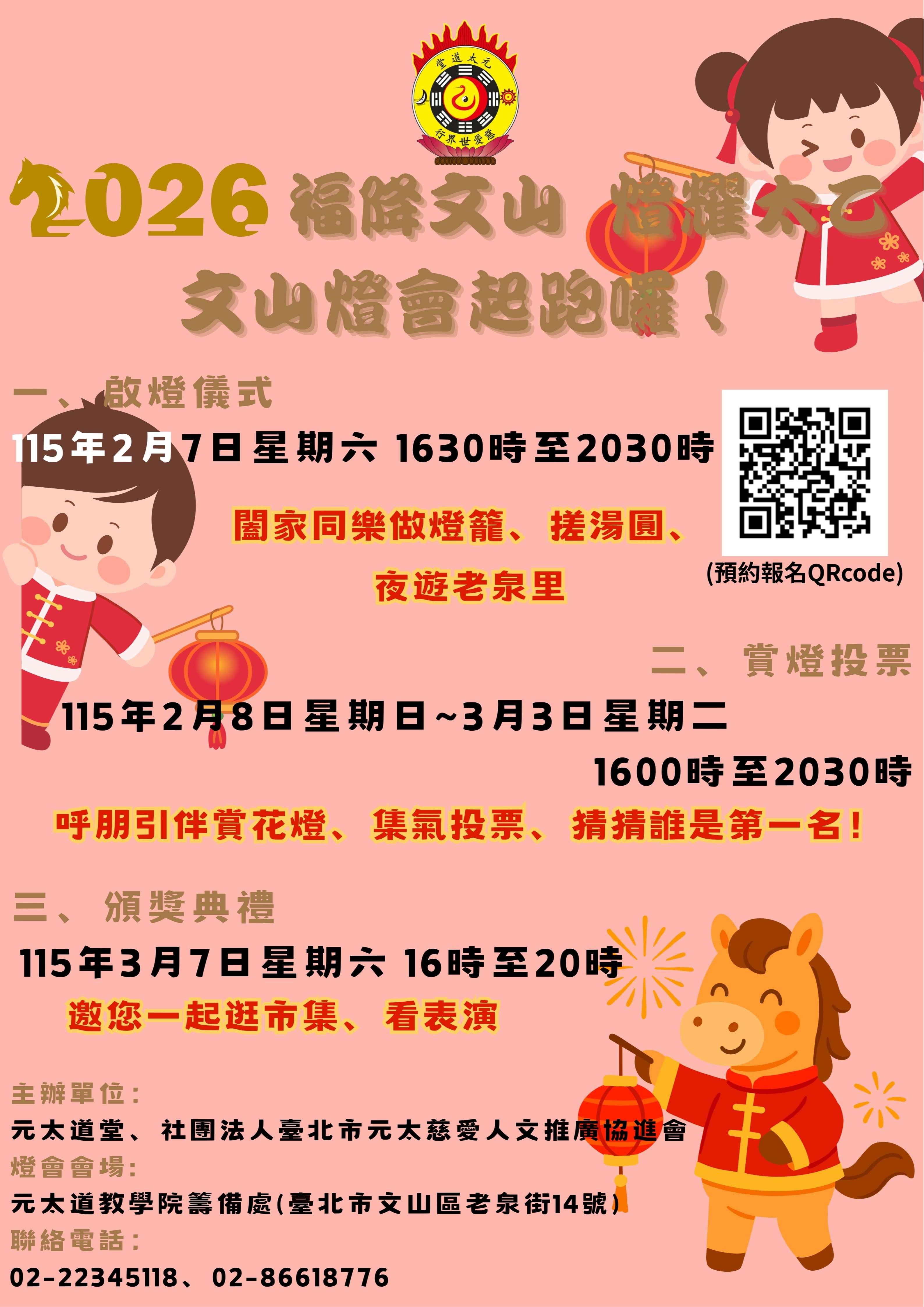 二、旨揭活動相關期程如下: (一)點燈儀式:115年2月7日(星期六)下午4時至8時30分, 屆時將安排傳統元宵燈節活動:搓湯圓、做火把、做燈 籠。 (二)活動地點:元太道教學院籌備處(臺北市文山區老泉街 14號)。 (三)投票參觀:115年2月8日(星期日)至3月3日(星期二) 止,每日下午4時至8時30分開放會場參觀進行人氣投票 (每日每人限投1票)。 (四)得獎公佈:115年2月12日(星期四)公布各校同學獲獎 名單(名次併同人氣獎於115年3月4日公佈)。(五)頒獎典禮:115年3月7日(星期六)下午4時至晚上8時; 邀請各界嘉賓、學校師長、同學及家長參加。