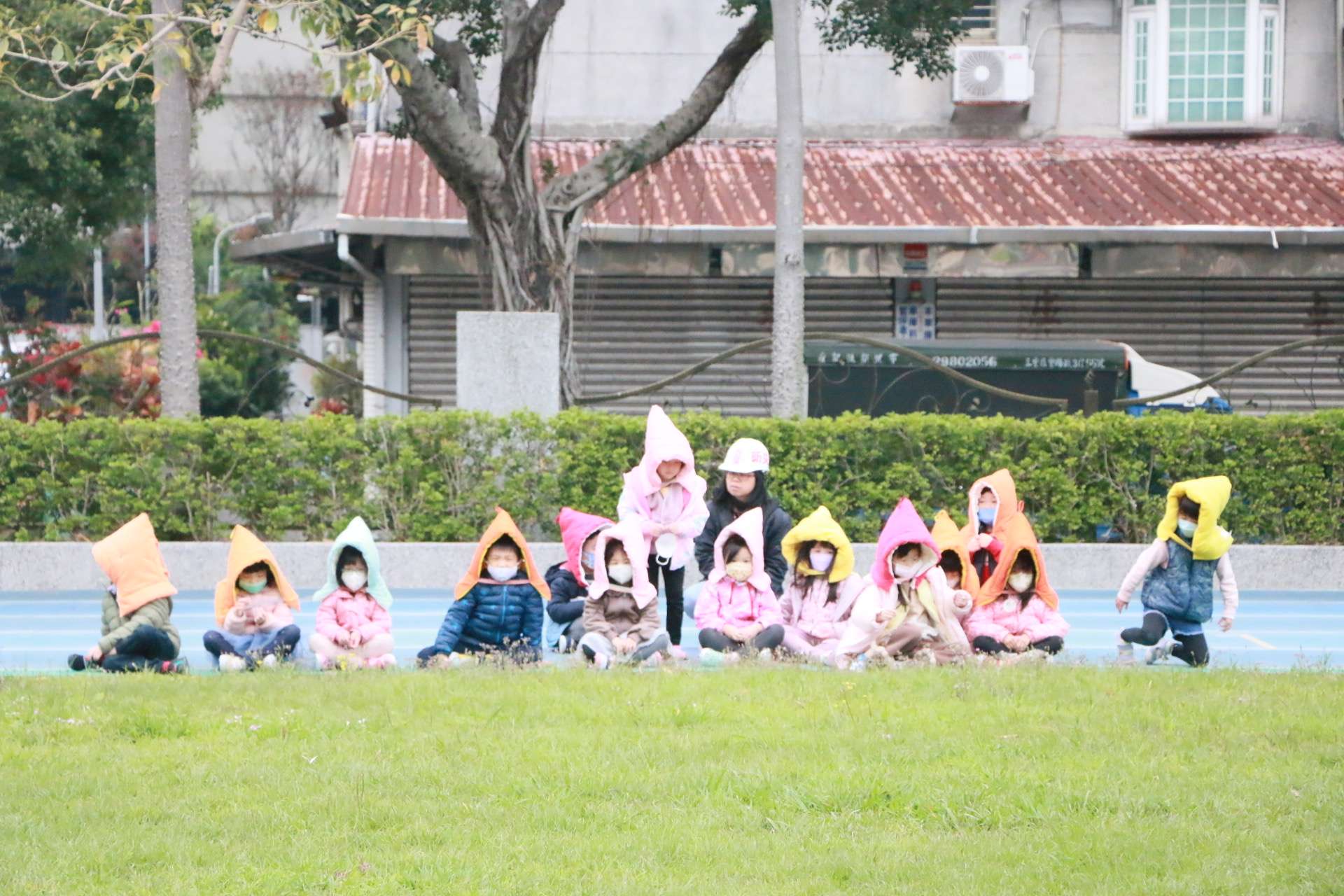 3.再好防災頭套,聽從老師的指揮,走到空曠處(操場)完成疏散避難,各班老師完成點名,回報組回報園舍狀況,孩子們都做得好棒!老師辛苦了!