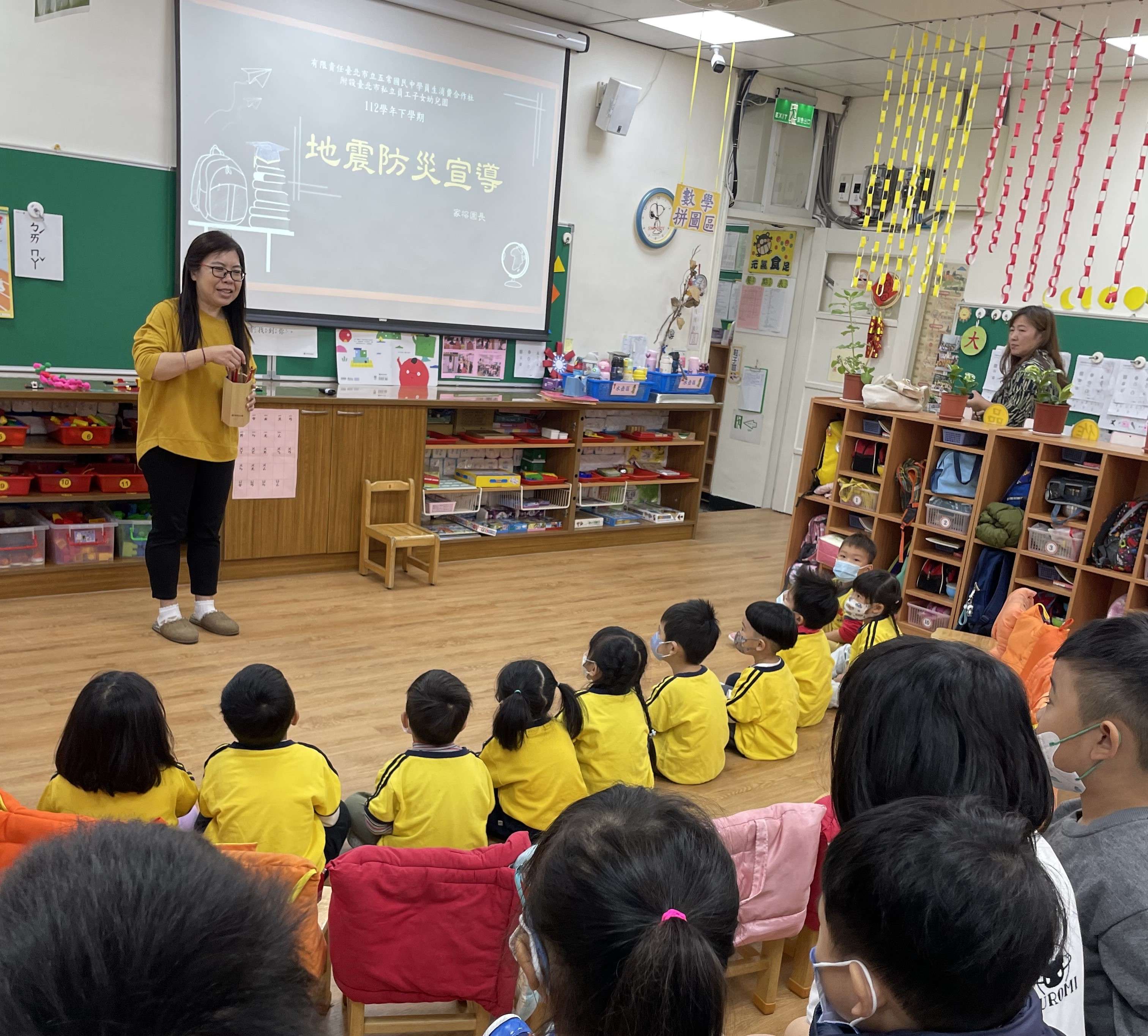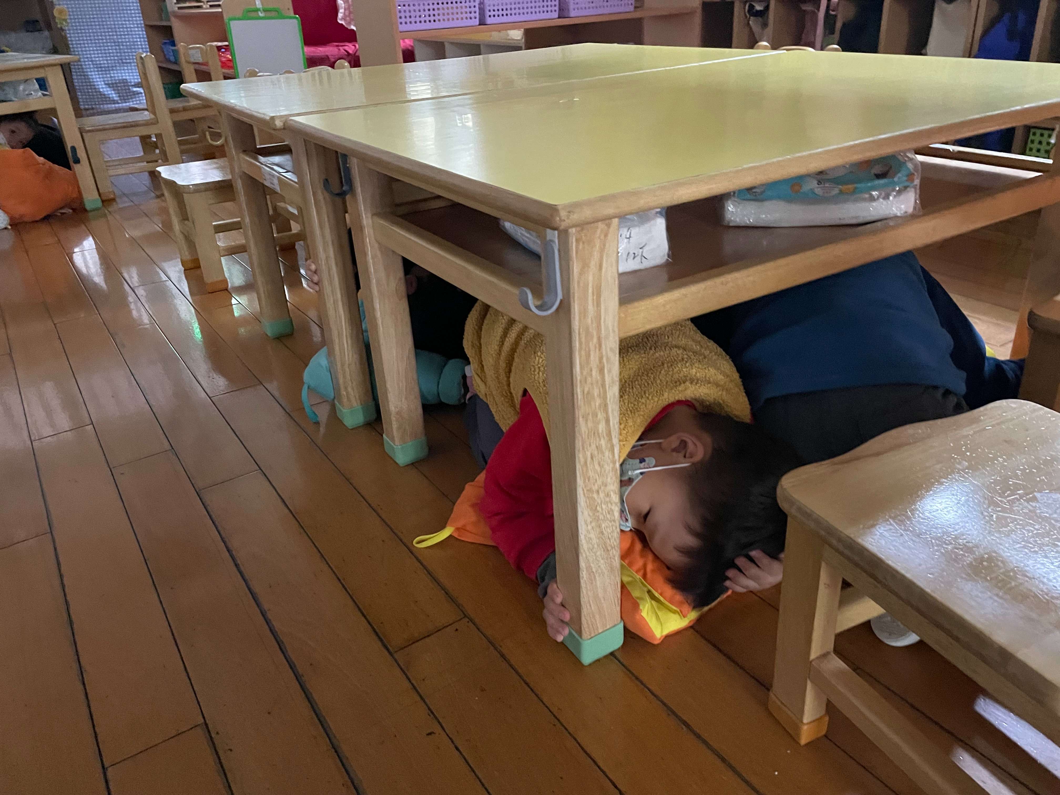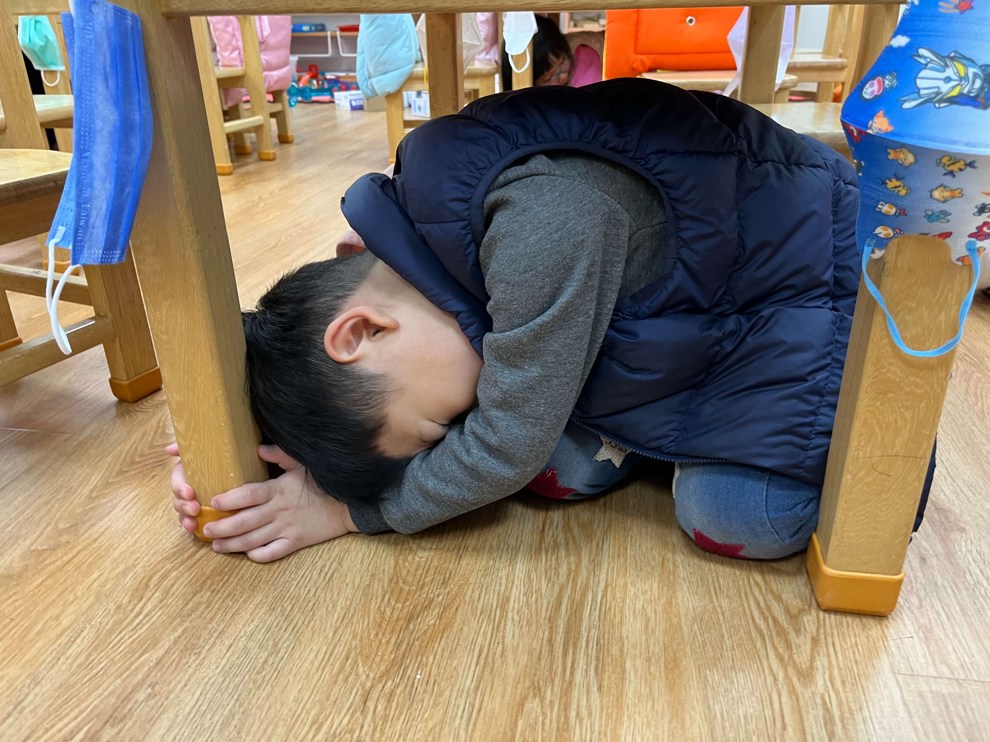 2.聽到地震警報聲,孩子們都能按照老師的指引就地做好:趴下、掩護、穩住的避難保命動作。