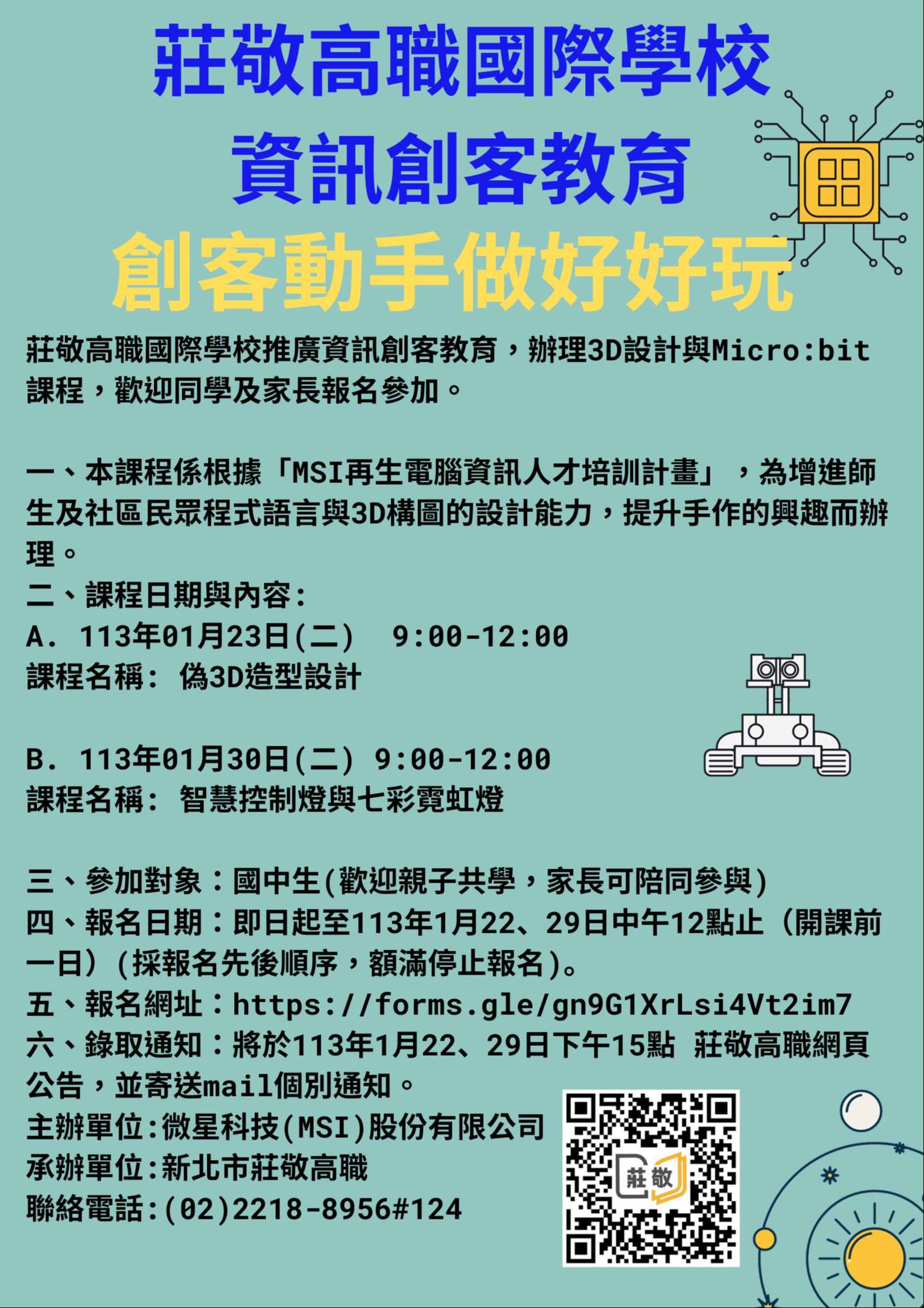 主旨:莊敬高職國際學校推廣資訊創客教育,辦理3D設計與