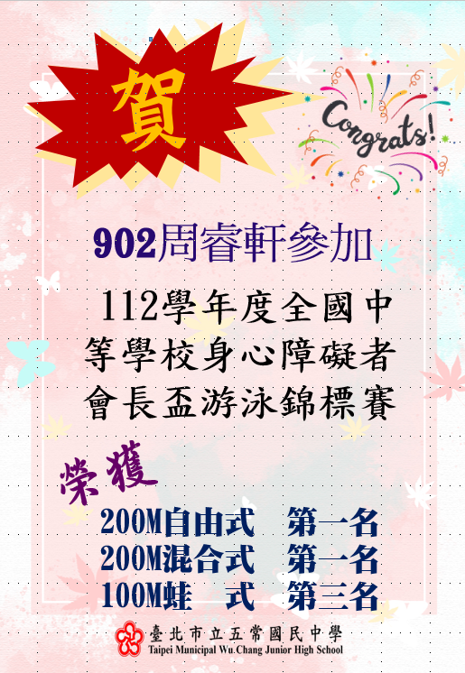 本校周睿軒同學參加112學年度全國中等學校身心障礙者會長盃游泳錦標賽