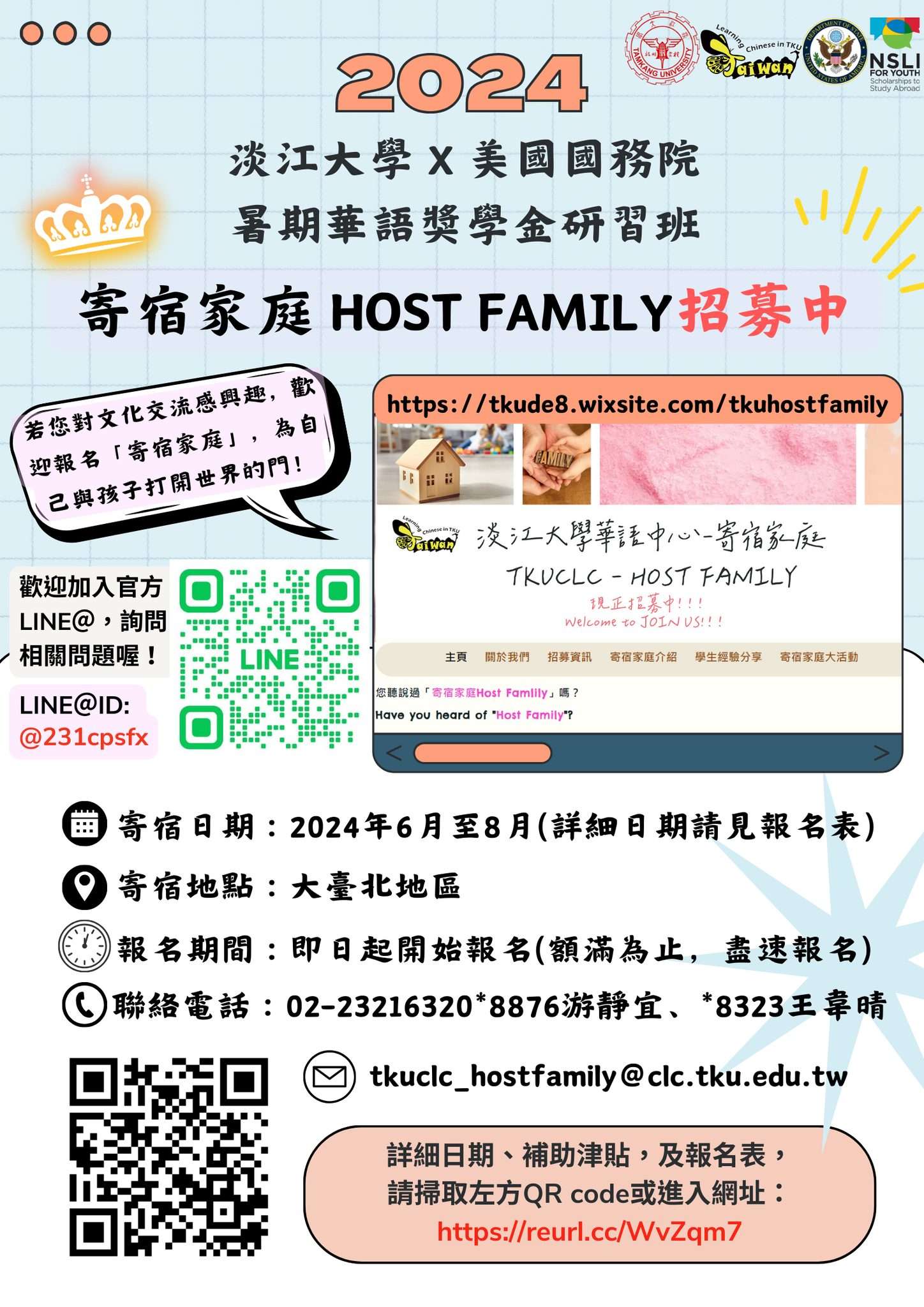 主旨:淡江大學推廣教育處華語中心承辦2024年暑期「美國國務院華 語獎學金研習班」,擬徵選臺灣寄宿家庭,請踴躍報名並 公告周知。