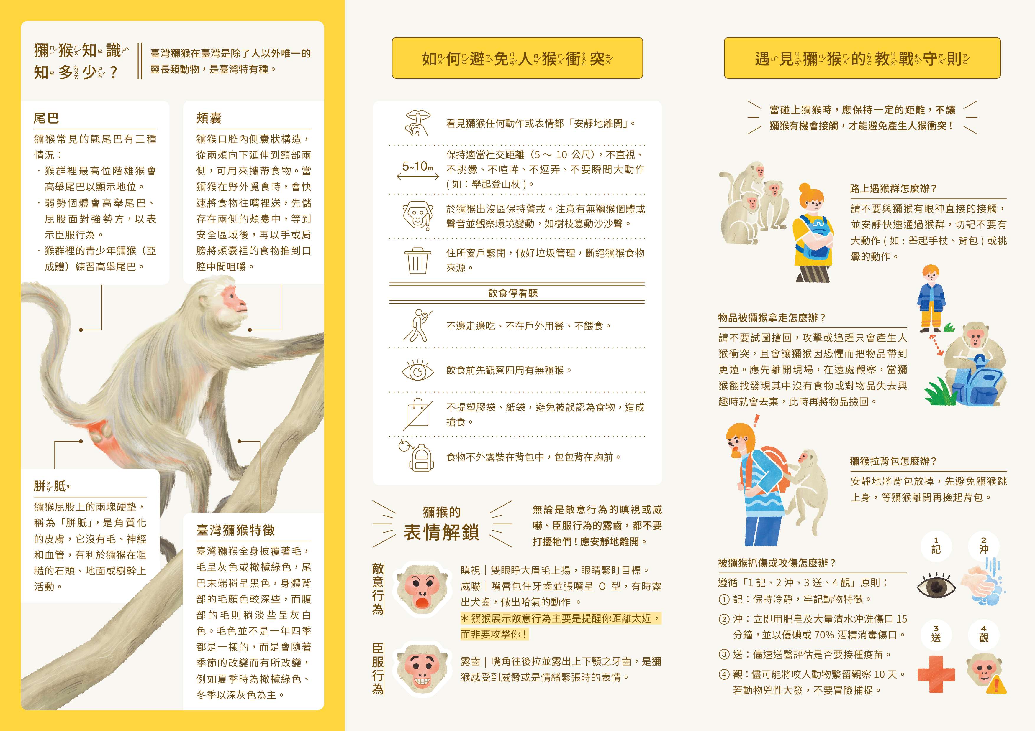 二、另考量農業部林業及自然保育署與所屬分署、農業部生物 多樣性研究所、內政部國家公園署陽明山國家公園管理處 與自然公園管理處、各縣市政府(不含離島縣市)、農民 與保育等團體,仍有在人猴衝突嚴重區域內進行宣導之需 要,將提供摺頁紙本(另寄送)供分送所屬單位及轄內 公、私立動物園擴大宣導。