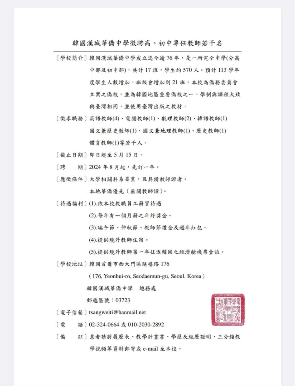 二、旨揭僑校擬招聘教師數名,其條件及待遇等資料詳徵才資 訊(如附件);有意應徵者請將初審資料備齊後,逕電 郵、電洽或郵寄至該校辦理。