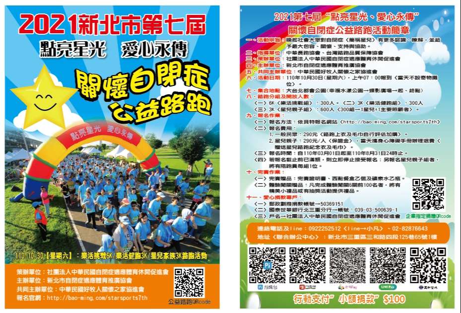 五、由於本次活動主旨乃鼓勵星兒家庭走出戶外,增加社會參 與及人際互動機會,凡星兒家族參加者均全額免費〈僅收 保證金,現場退還〉,並贈送路跑紀念服、毛巾、餐點、 闖關獎品及抽獎獎品等,此等均賴社會大眾支持,凡有捐 贈或贊助者,捐款帳戶如下: (一)銀行名稱:國泰世華銀行北三重分行 (二)戶名:社團法人中華民國自閉症適應體育休閒促進會 (三)帳號:039-03-501020-7