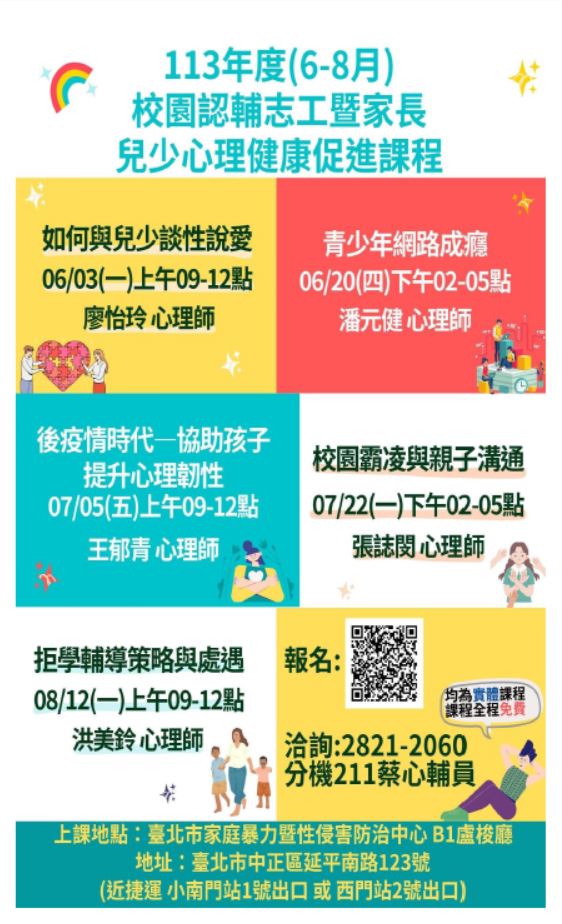 「113年度校園認輔志工暨親職教育系列—兒少心理健康促進課程(6月至8月)」宣傳海報如下圖,歡迎認輔志工及家長踴躍報名參加。