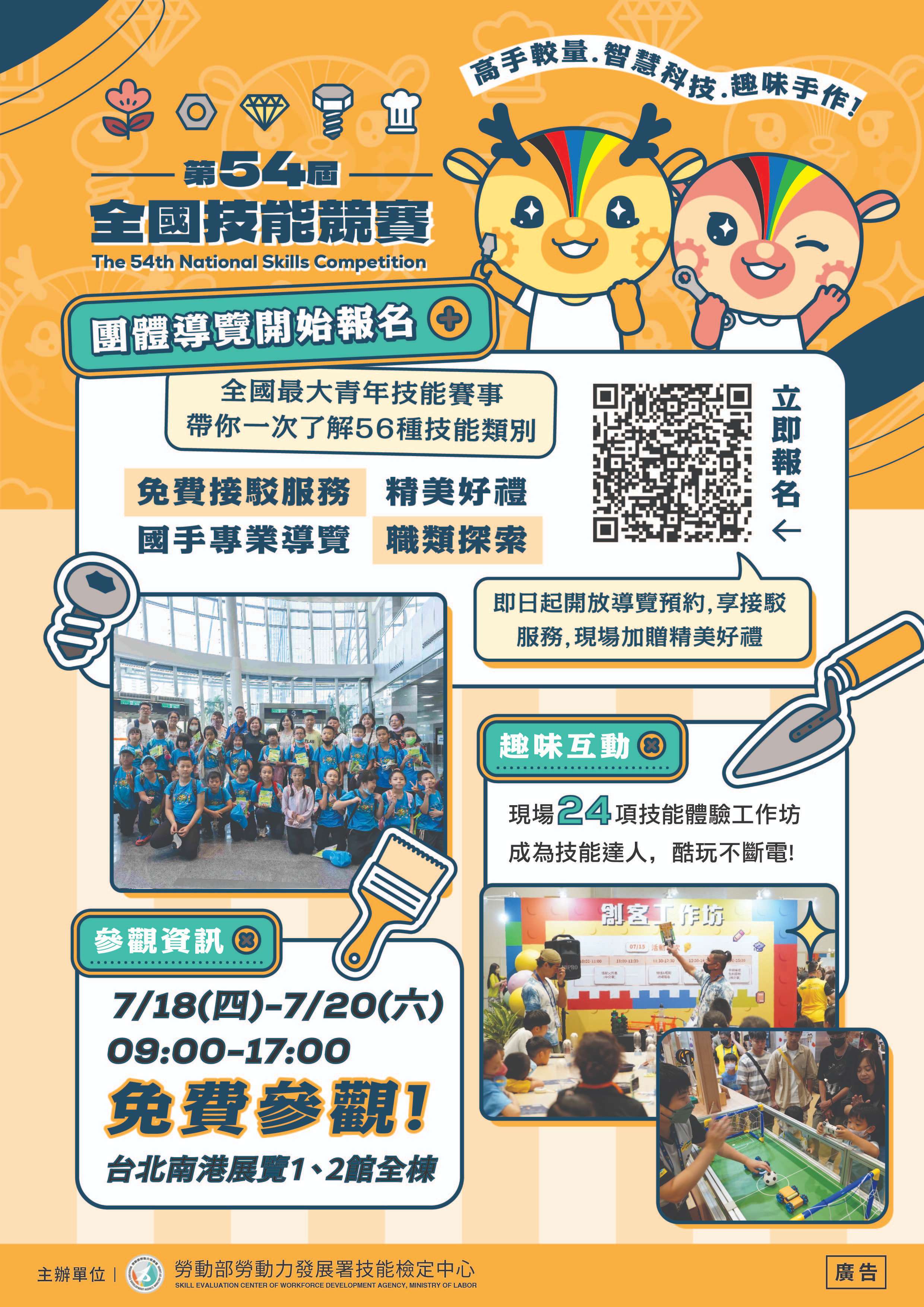 二、旨揭競賽活動訂於113年7月18日(星期四)至7月20日(星期六)假臺北市南港展覽館1、2館(臺北市南港區經貿二路1、2號)舉辦,本次辦理青年組56職類與青少年組13職類,共計69職類,為職業訓練與技職教育之年度盛事。