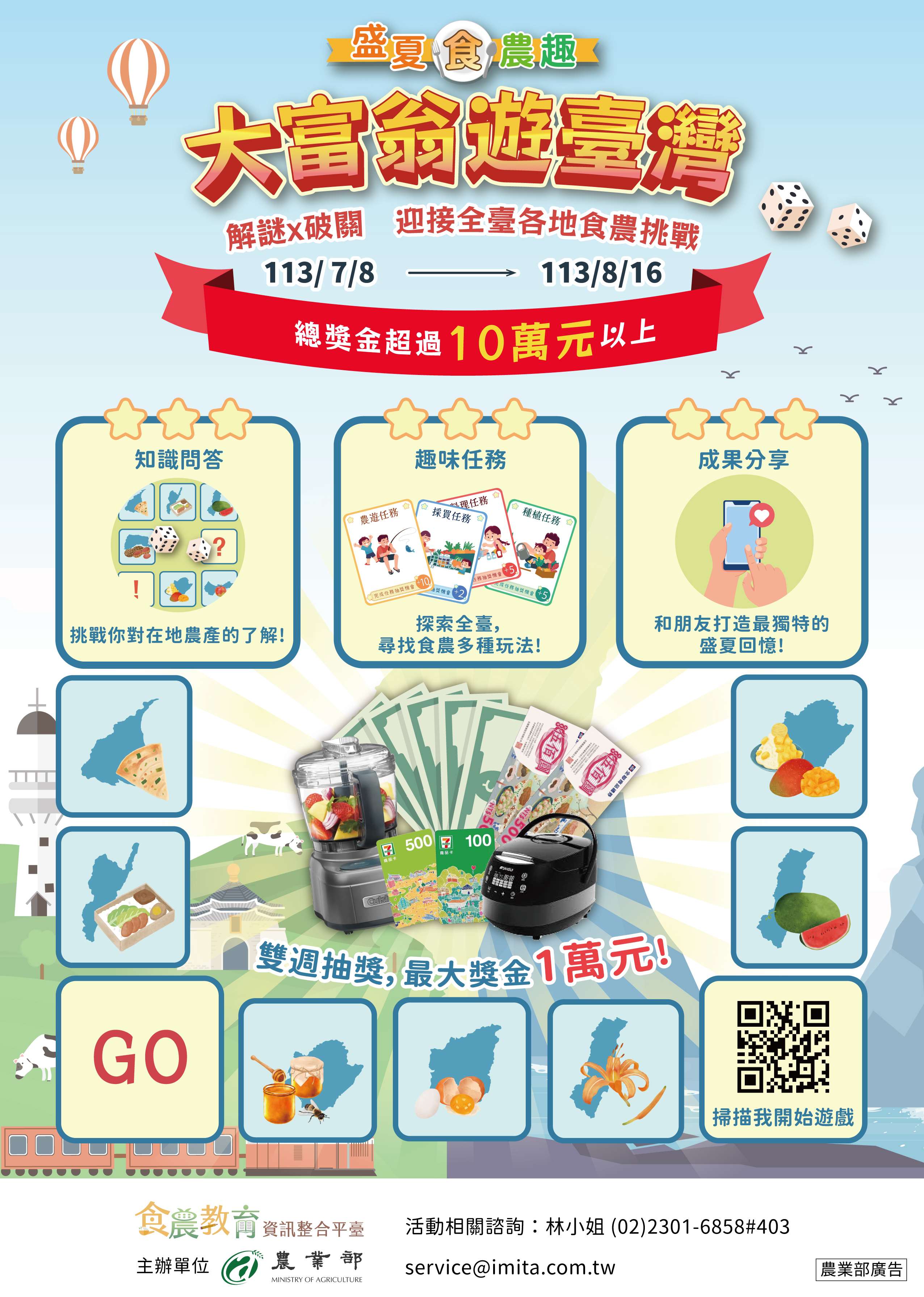 三、為促使大眾更加瞭解食農教育,農業部訂於113年7月8日至 8月16日舉辦「盛夏食農趣:大富翁遊臺灣」食農教育推廣 活動(網址:https://fae.moa.gov.tw/2024event/),提 供食農教育相關知識問答、任務體驗與成果分享等遊戲,參與活動即可抽獎,總獎金超過10萬元,有興趣者歡迎踴 躍參與。