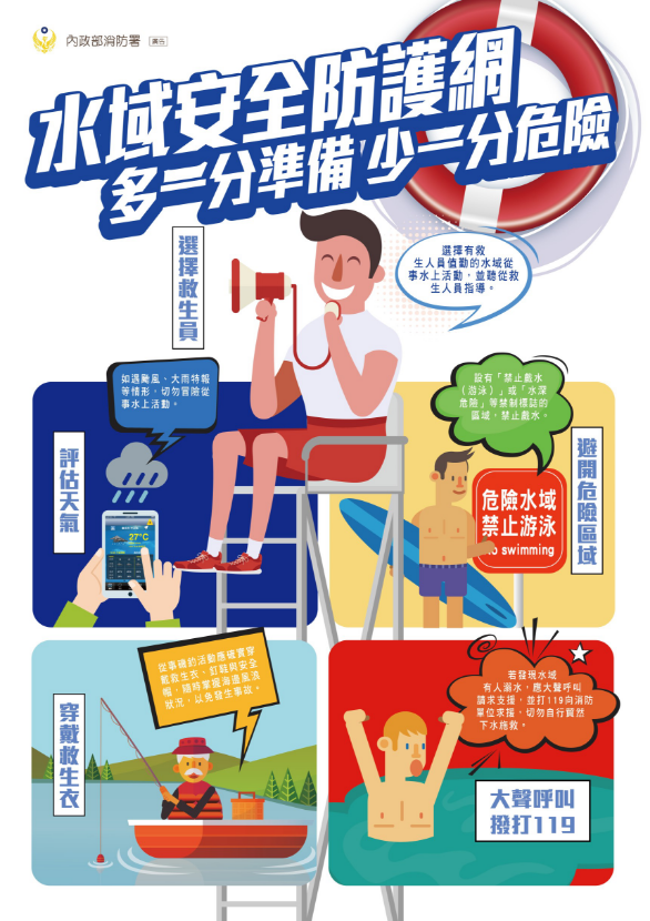生教組8月份防災宣導---「防溺」 考量現值夏季炎熱時節,同學常至溪邊海邊等水域地區戲 水玩樂,消除暑氣。提醒同學做好防溺措施,避免溺水 造成生命的損害。
