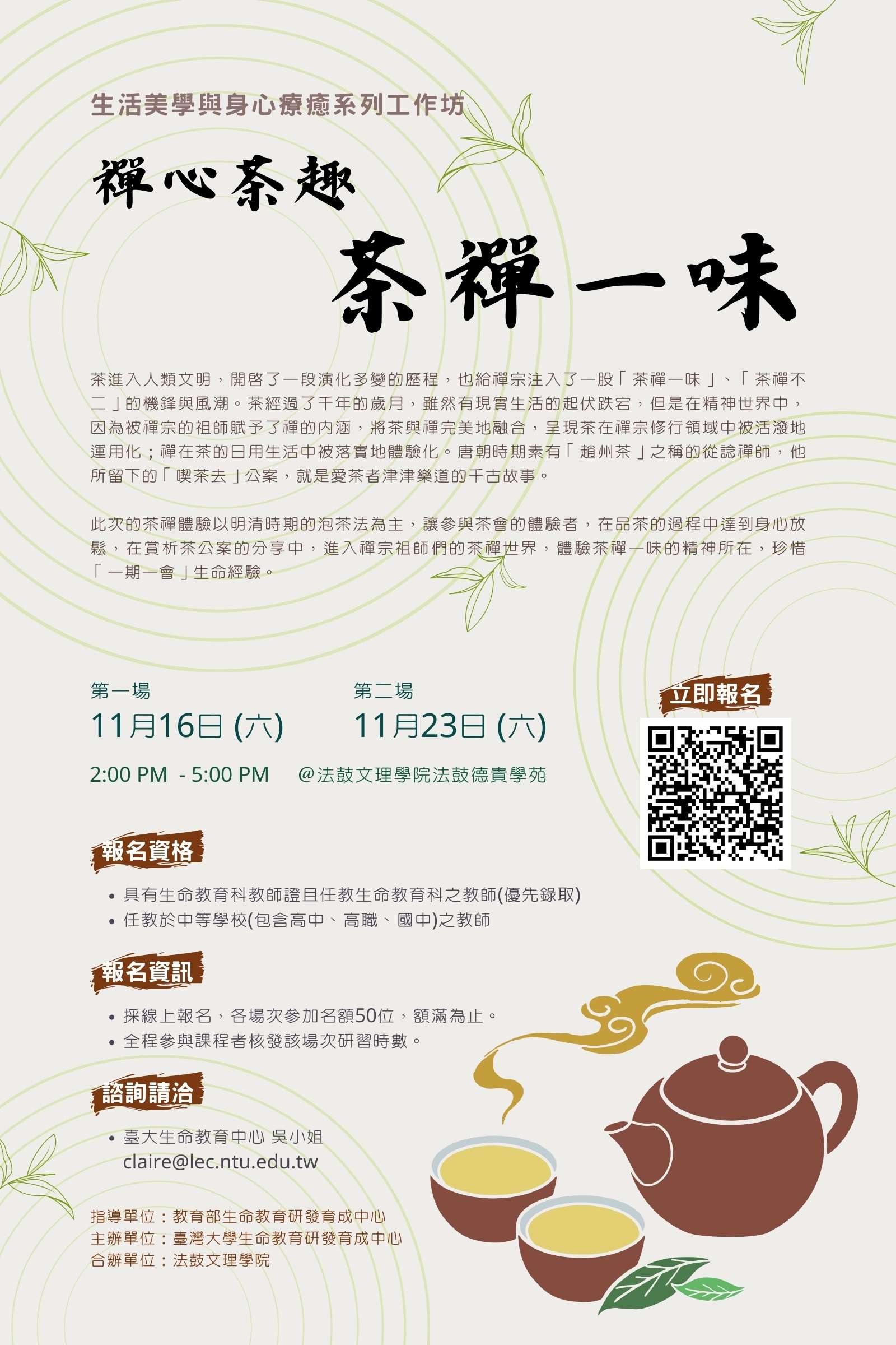 二、本研習規劃2個場次,詳細內容請參閱附件簡章及海報。 (一)研習場次:113年11月16日、11月23日。 (二)研習地點:法鼓文理學院法鼓德貴學苑。 (三)研習費用:全免,交通請自理或由學校酌予補助。 (四)參與對象:各公私立高中高職及國中教師。 (五)參與人數:各場次50人,額滿為止。 (六)官網報名:https://reurl.cc/E6MxMv。