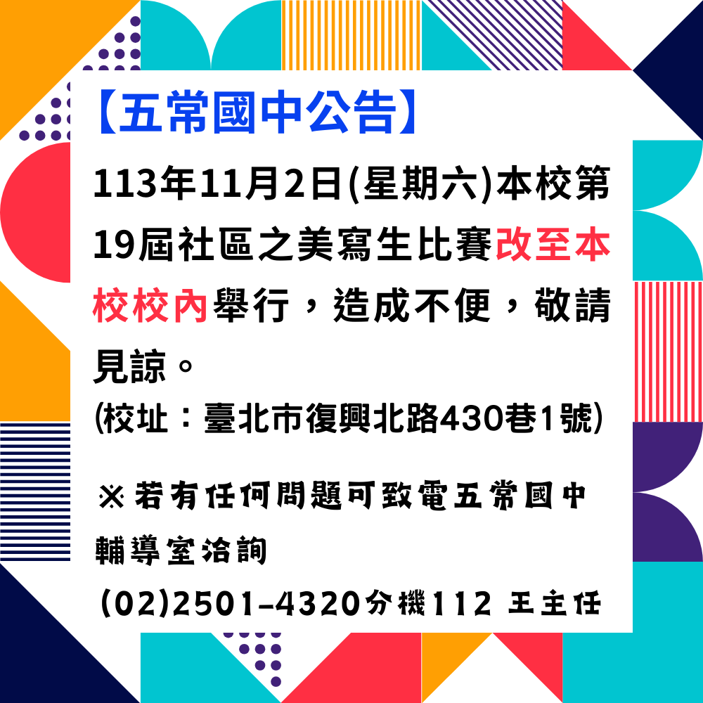 原訂11月2日(星期六)於榮星花園舉行本校第19屆社區之美寫生比賽,受颱風影響,活動改至本校校內舉行。