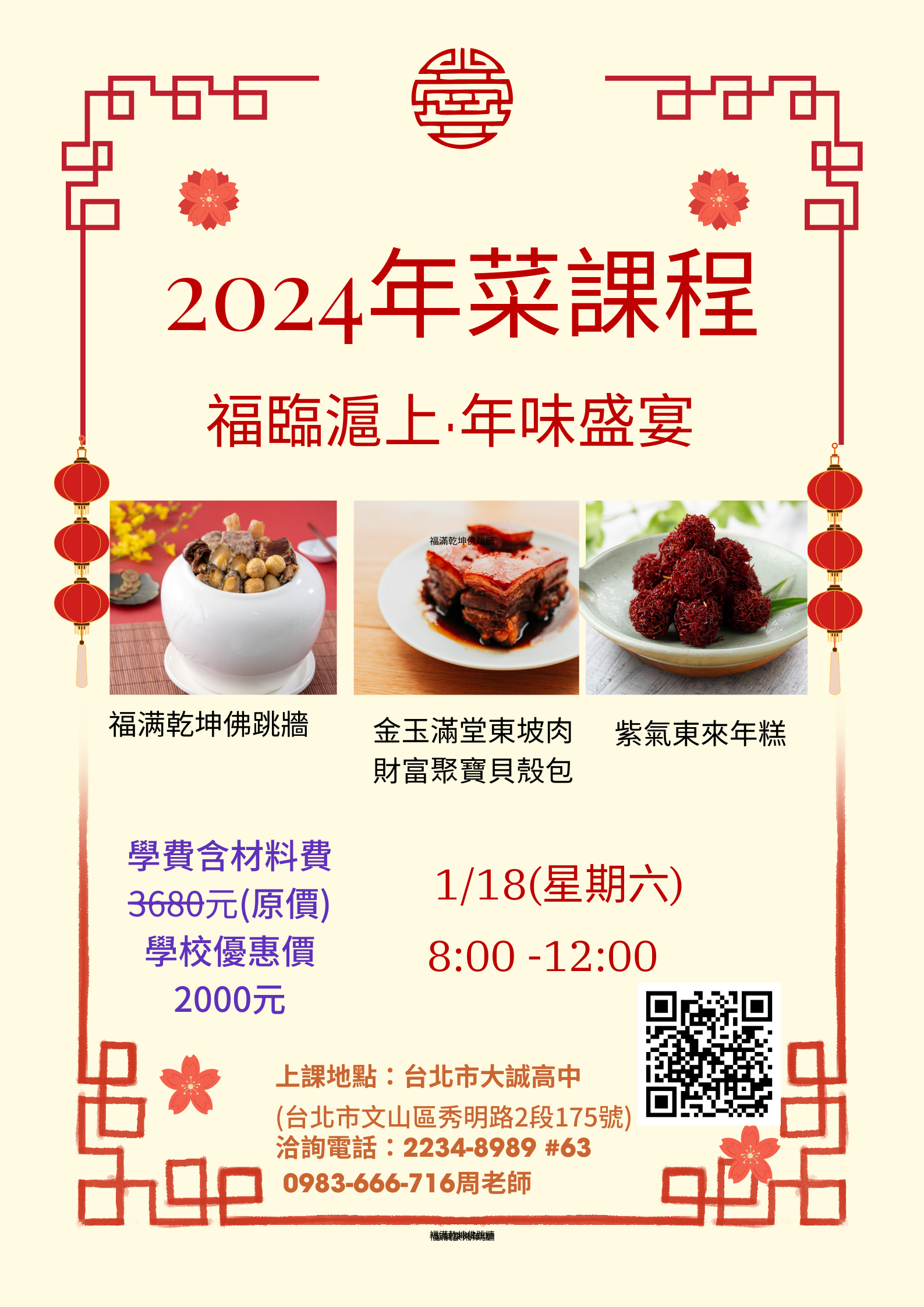 一、本校推廣教育中心辦理【中餐烹調2024年菜】體驗課程, 以傳統經典年菜為主,由本校餐飲科主任帶大家一起完成豐盛佳餚。