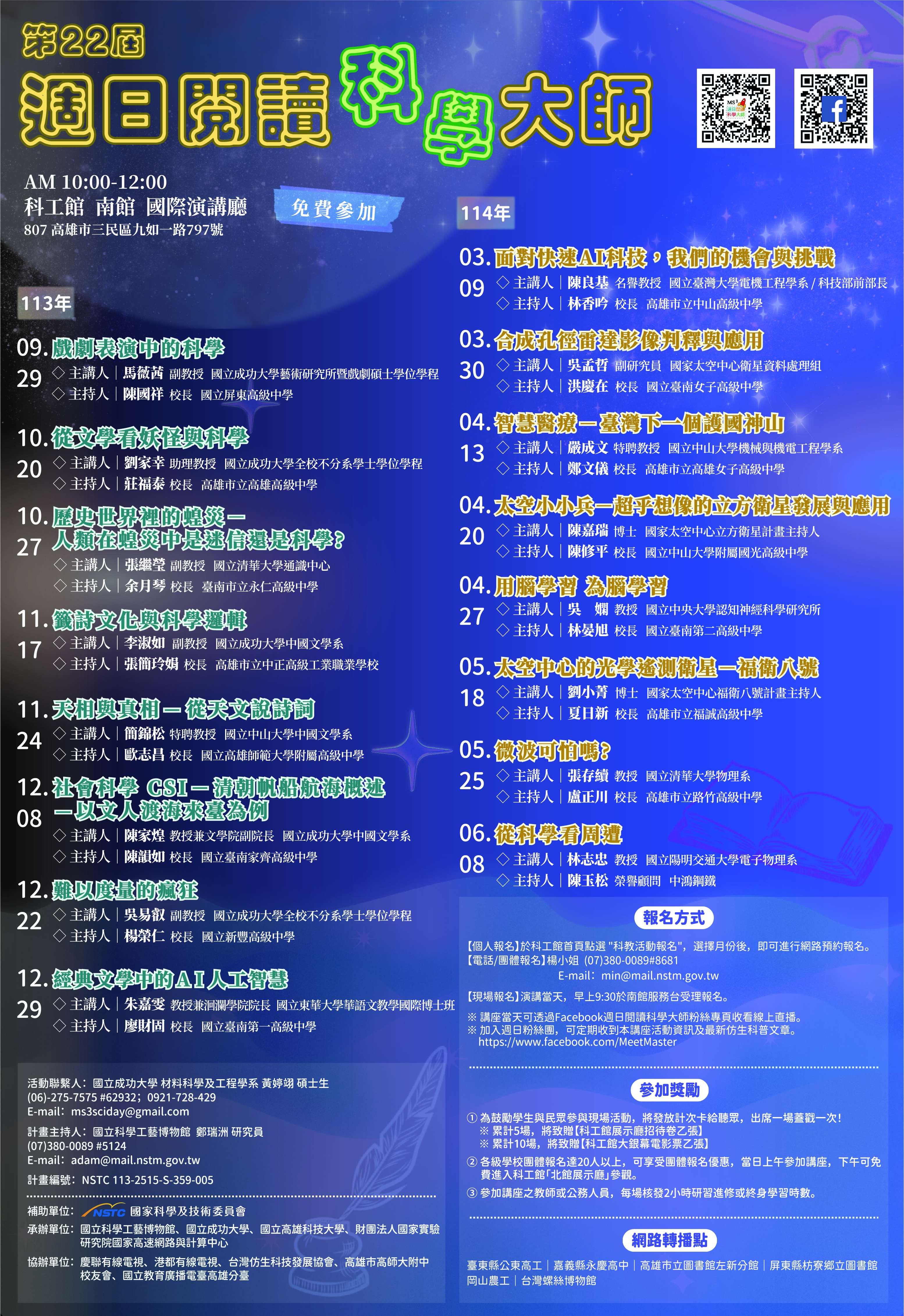 二、「週日閱讀科學大師」講座目的為引發學生及社會大眾對於科學的理解、興趣及參與,以增進其科學素養,是專為年輕朋友與社會大眾在週日上午舉辦的科普講座。