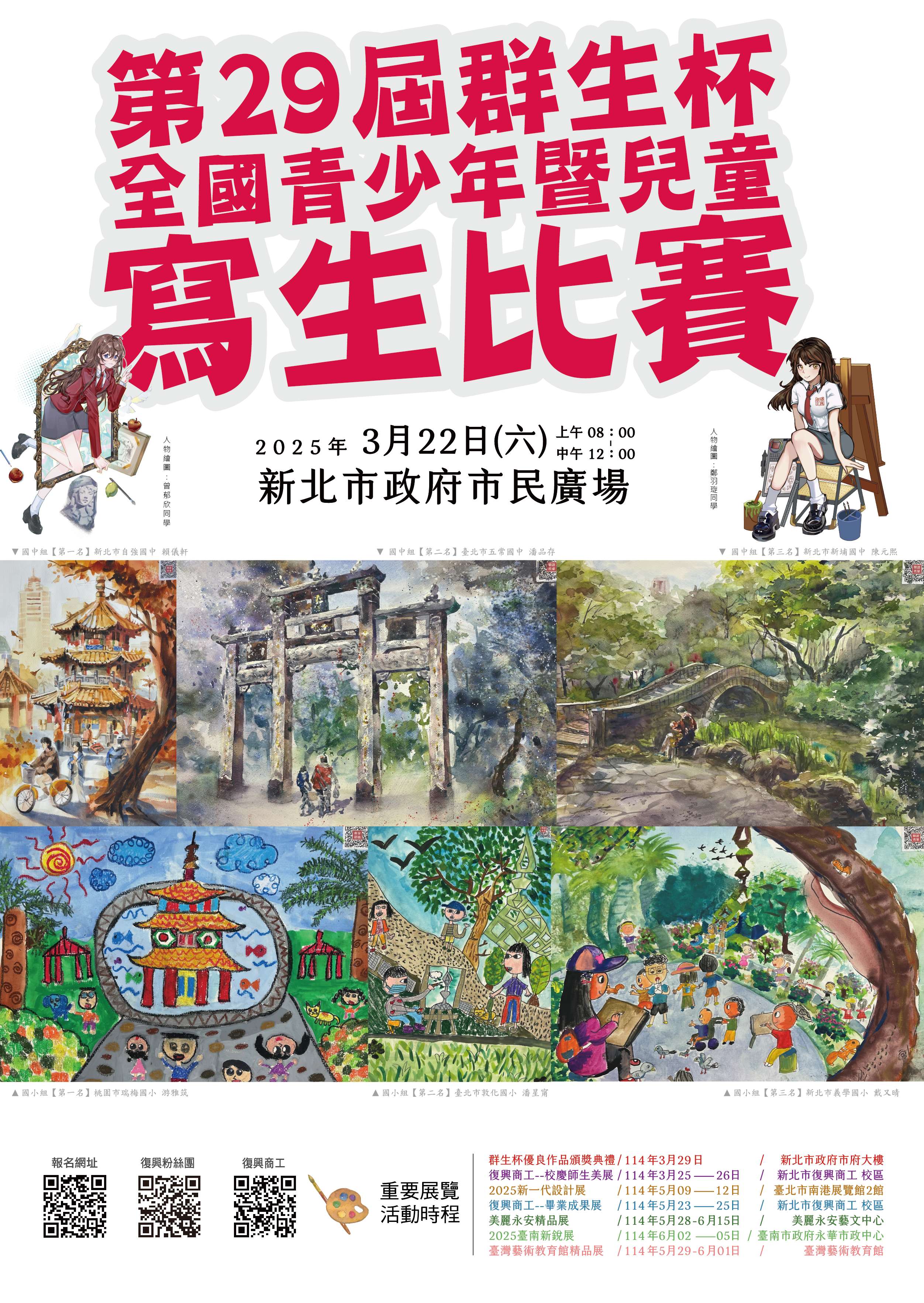 說明:一、比賽時間:114年3月22日(星期六) 上午8~12時。(風 雨無阻)。二、比賽地點:新北市市民廣場,廣場內所有 可供寫生範圍皆可,中央舞台設有服務台領取比賽紙張。 三、比賽方式:採現場寫生方式,題材以新北市市民廣場 建築及景觀為主,比賽使用四開畫紙,由本會提供,用具 一律自備,採用任何描繪工具、材料皆可,表現形式不 拘。不得自備紙張或由他人代筆、修改,違者取消資格。 四、國中組獲獎同學得入選以上獎狀者,畢業申請本校優 先錄取。五、線上報名網址: https://reurl.cc/xpLQve (即日起至114年3月17日(一)23:59止)六、比賽簡章公告於群生基金會網站首頁 http://ischool.fhvs.ntpc.edu.tw /ischool/publish_page/193/,敬請下載查閱。