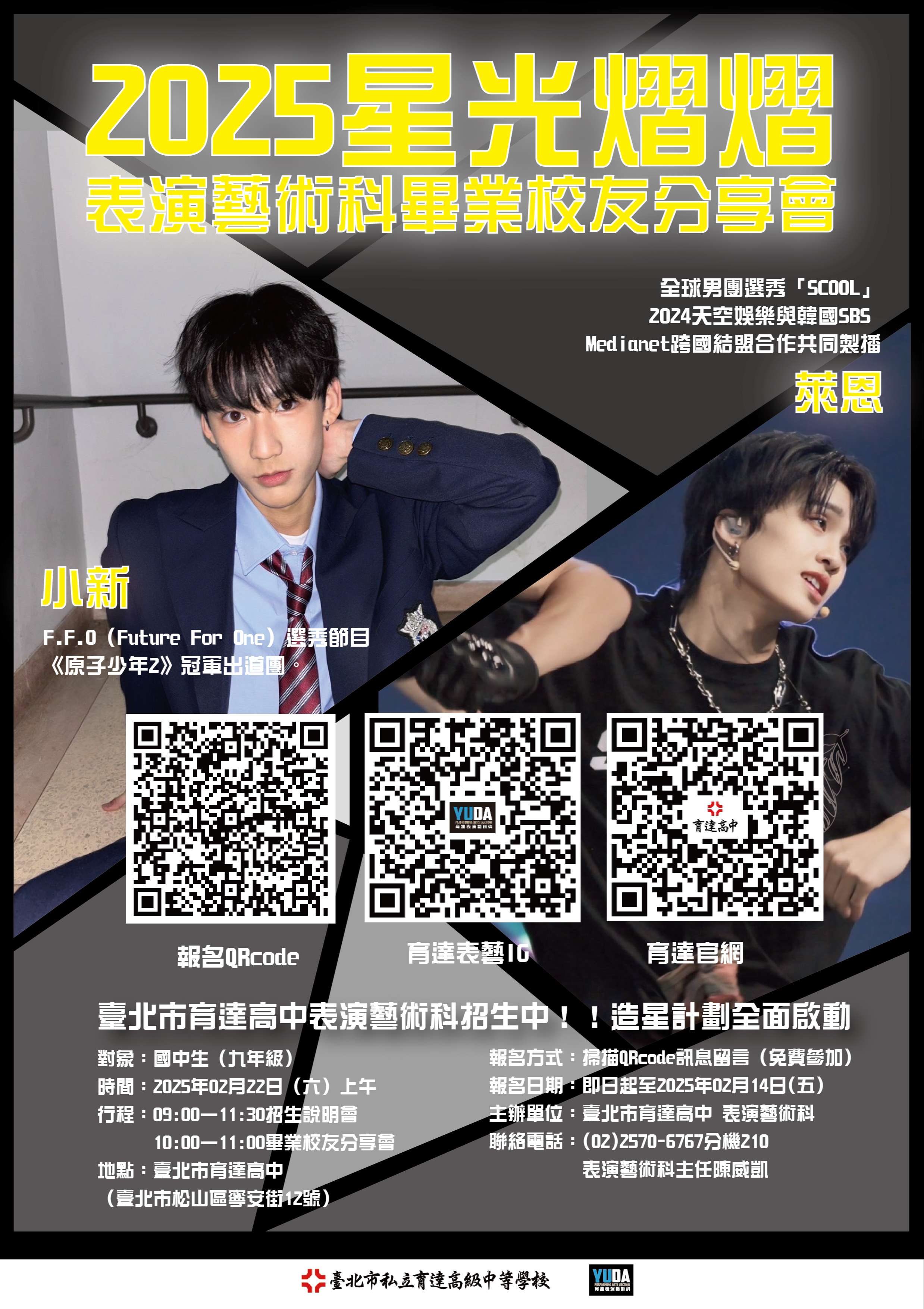 一、育達高中以掌握趨勢,培育達人作為宗旨。陶冶專業表演藝術(舞蹈、戲劇、綜藝)人才,舉辦畢業公演、組展、班展及活動競賽,提升學生表演實力,配合展演實務課程, 奠定其發展之基礎,並透過產學合作,掌握業界與流行的脈動,增進學生的專業技能與涵養。本次活動特邀本科兩位傑出校友(第七屆畢業生)返回母校,和學弟妹及國中生 們分享其自身星路歷程、在校所學點滴、表演藝術相關之問答交流。