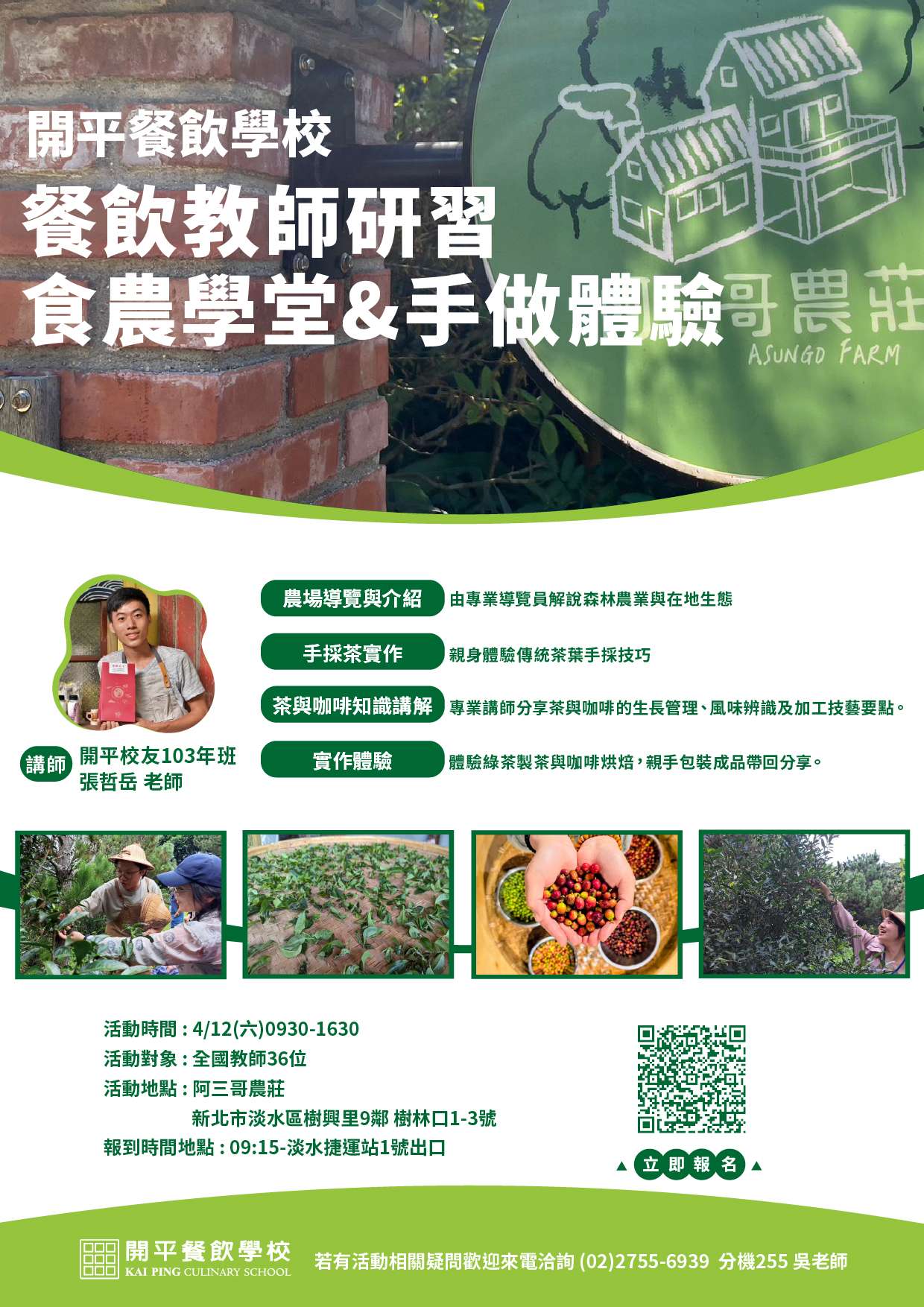 四、報名方式:採線上報名,請上”全國教師在職進修資訊網” 報名,課程名稱:餐飲教師研習_食農學堂&手作體驗,課程代碼:4919597。報名截止日期:114年04月09日(三), 課程名單將於開課前三天確認遴選名單。