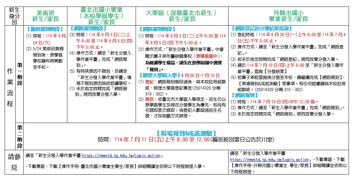 國七報到方式依國小身分別而有所差異,敬請貴家長收到各國小轉發之新生資料後,依指示至新生線上平臺進行網路報到,協助辦理下列流程,以利敝校隨時轉知最新消息,並先行匯整相關事宜。謝謝您!