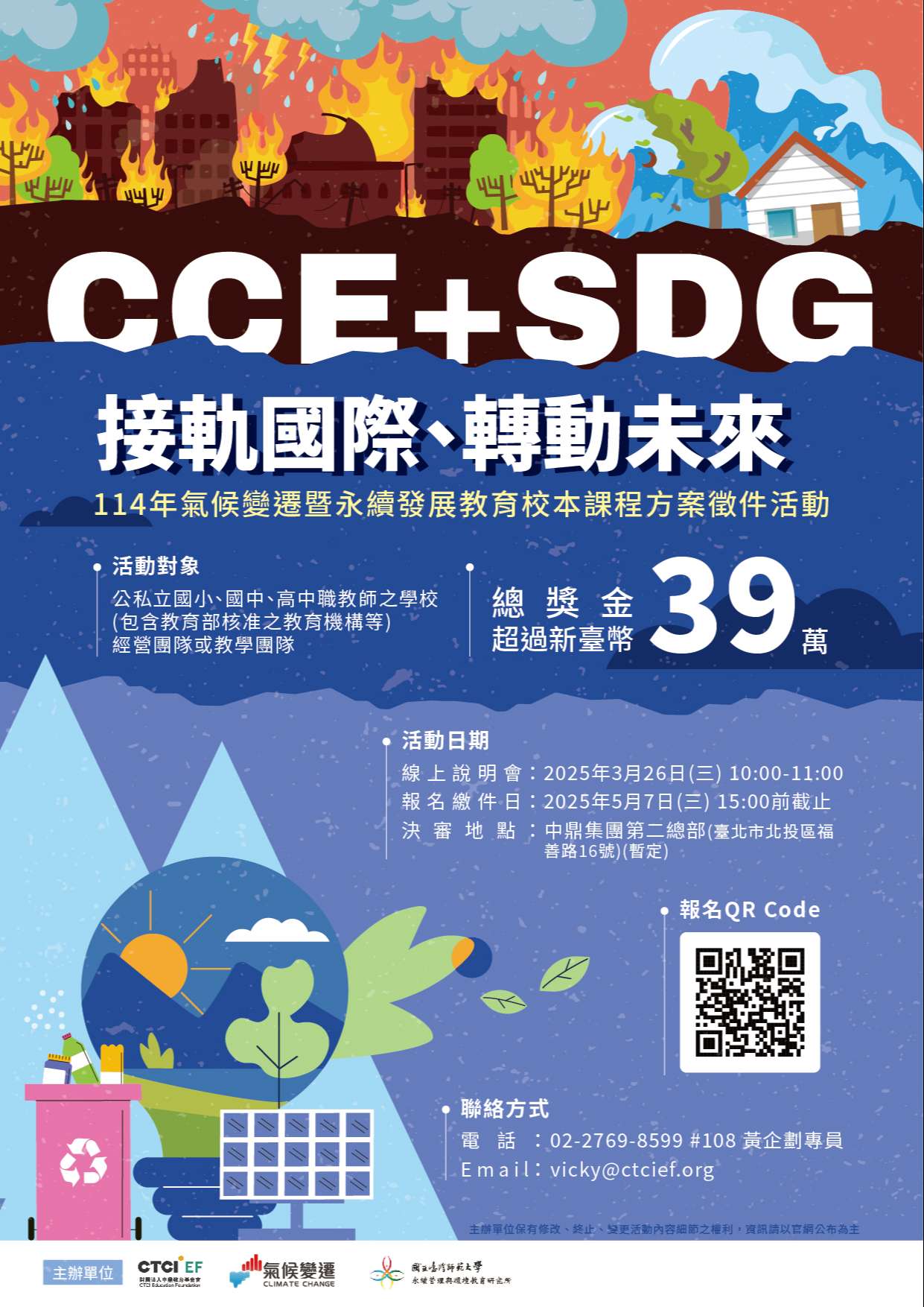 說明: 一、為強化我國各級教育人員對於氣候變遷教育(CCE, climate change education)、永續發展教育(ESD, education for sustainable development)與聯合國永續 發展目標(SDGs)的認識,響應我國《氣候變遷因應法》對 於氣候變遷教育的重新定位,與賴總統於國家氣候變遷對 策委員會第三次會議之指示(https://www.president.gov. tw/News/39011),朝向「氣候變遷暨永續發展教育」 (CCESD=CCE+ESD) 國際趨勢邁進,連結永續發展目標 (SDGs)後,成為CCESDG。中鼎教育基金會(CTCIEF) 特與教 育部氣候變遷教學資訊平臺氣候變遷教育推動計畫、國立 臺灣師範大學永續管理與環境教育研究所共同籌辦旨揭徵 件活動,以鼓勵教師研發「氣候變遷暨永續發展教案」。 二、徵件內容需以聯合國推動之「氣候變遷教育」(CCE)結合「永續發展教育」(ESD)為主軸,以氣候變遷相關議題為題材 (譬如減緩、調適、氣候科學、淨零排放、氣候金融、公正轉 型等)建構校本課程,考量「永續發展」之跨領域與多重視角 特性,將全球與在地之關鍵經濟、社會、環境等綜合議題納入 課程主題之考量,並與在地特色結合。 三、線上徵件說明會:2025年3月26日(三)10:00-11:00,舉 行Google Meet線上會議(https://meet.google.com/bwz-gxigcfn ),並公告於本會臉書粉專(https://www.facebook.com /CTCIEF/)及官網。 四、活動資訊摘要: (一)報名資訊:報名資格:我國公私立國小、國中、高中職 教師之學校(包含教育部核准之教育機構等)經營團隊或教學團 隊,成員需來自同一學校(非跨校合作)。成員可包括同一學 校之正職教師、實習教師、代理教師、代課教師及行政人員等 教職員。 (二)報名方式:活動免費報名參與,僅接受線上報名: https://forms.office.com/r/cz16YAeqSd(須完成填寫送出線 上表單+上傳提案資料才視為完成報名申讀)。 (三)報名期限:自即日起至2025年5月7日(星期三)下午3時 止。 (四)採組隊報名參加,一組由3-5人組成,且每人僅能報名一 組(參賽人員一經確認,即不得更改);每所學校報名件數不 限。 (五)活動聯絡人:中鼎教育基金會黃企劃專員,電話:(02) 2769-8599分機108。電子信箱:vicky@ctcief.org。