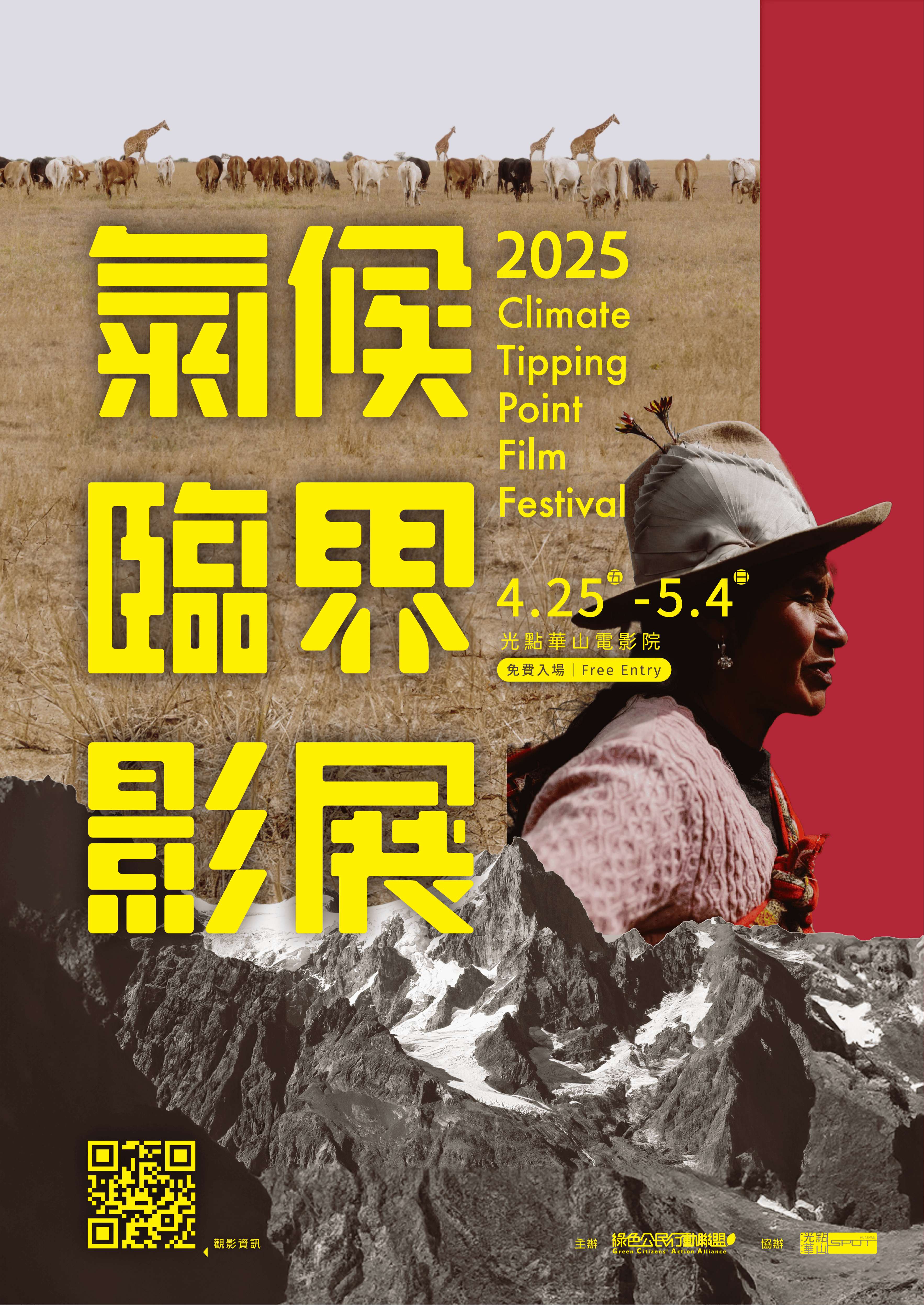 說明: 一、由綠色公民行動聯盟主辦之「2025氣候臨界影展」 (Climate Tipping Point Film Festival),訂於114年4 月25日(五)至5月4日(日)於臺北市光點華山電影館舉 行。 二、本屆影展精選15部紀錄片,橫跨歐洲、美洲、亞洲、非 洲,呈現了西伯利亞、冰島、秘魯、肯亞、烏干達及台灣 當下的環境衝擊與挑戰,不僅揭示人類忽視生態臨界點的 高昂代價,也號召著對氣候正義的集體覺醒,對跨越疆界 行動的即時回應。影展規劃「氣候災難地圖」、「跨界氣 候行動」、「核殤記憶真相」三大單元,直擊全球環境危 機。 三、影展每一場次皆為「免費索票入場」,可於開演前20分鐘至放映廳外之氣候臨界影展服務台索取,每人至多索取2 張,限當日當場次使用。座位有限,索完為止,票券遺失 或毀損恕無法重新補發。請準時於開演前10分鐘憑票入 場,自由入座,不劃位。一張票限一人使用。將視入場情 況,於開演後5分鐘開始開放現場排隊候補入場。為維護觀 影品質,開演後10分鐘一律不得入場,亦不得換票。詳情 請看附件。 四、本影展為免費公益性質,主辦方保留調整索票、入場規則 及場次資訊之空間,請至綠色公民行動聯盟臉書粉專留意 最新公告,或以現場主辦單位公告為準。如有索票問題, 請逕洽主辦單位:gcaa@gcaa.org.tw,電話:02- 23930500。