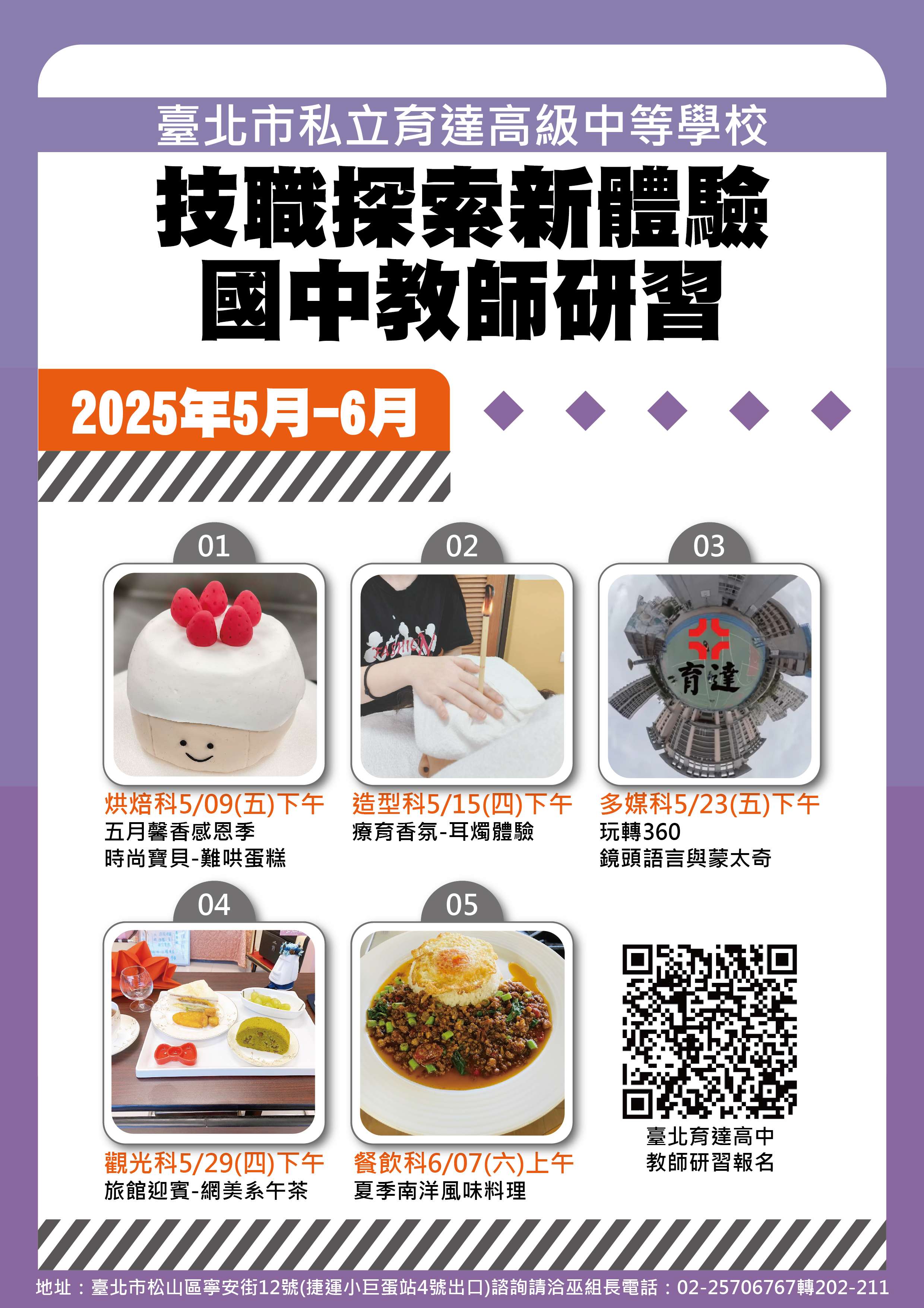一、本校辦理2025年技職探索新體驗─國中教師研習活動,課 程多元豐富深獲好評,歡迎各國中教師報名參加。