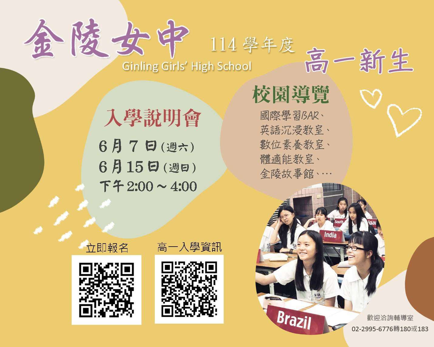 一、本校為提供國三家長及學生,了解金陵教育理念及特色課程,特辦理校園參訪暨說明會,敬請協助公告並鼓勵踴躍報名。