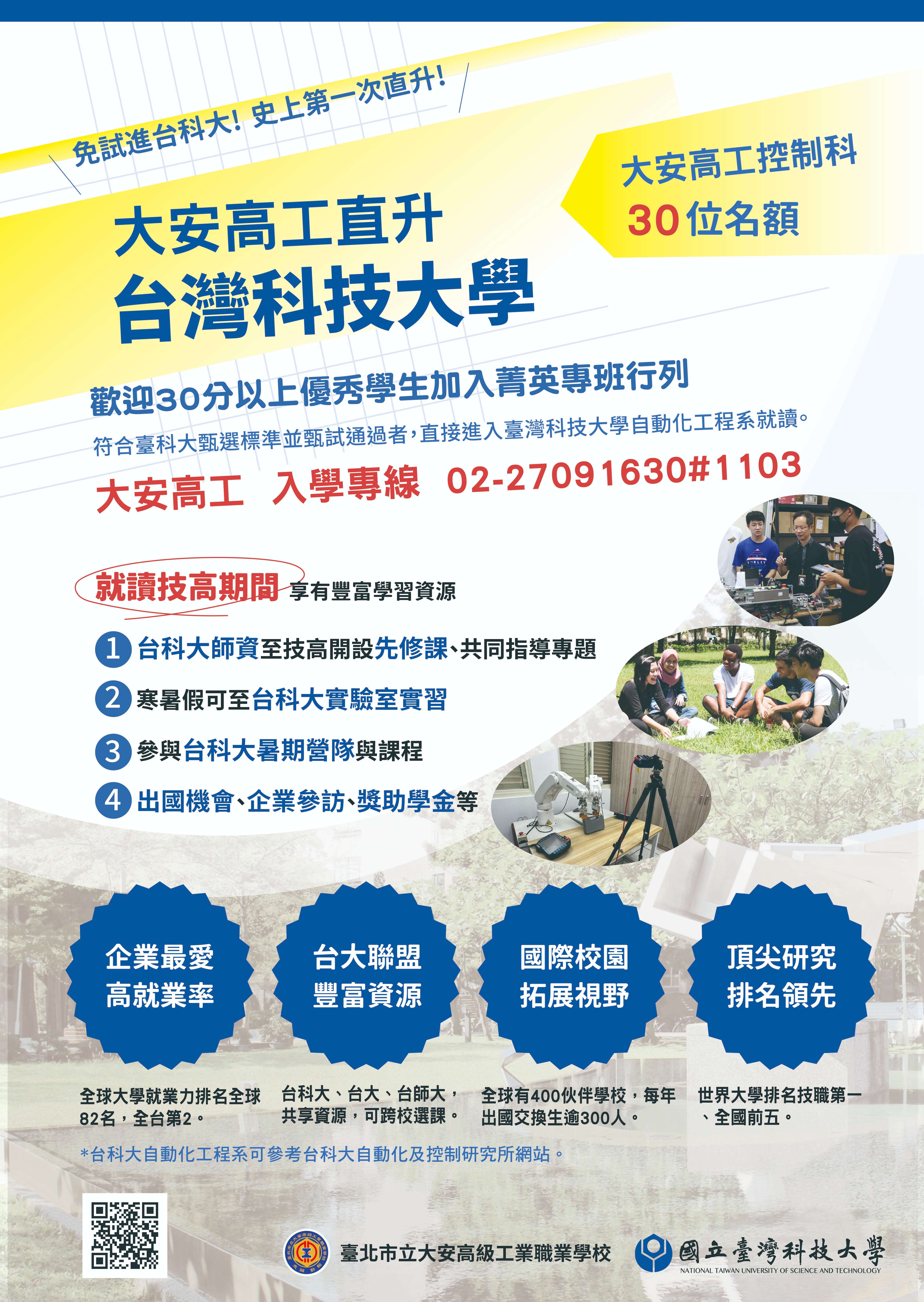 二、本市大安高工與國立臺灣科技大學合作3+2新五專模式「直升臺科大專班」,為具實作潛力學生打造直升國立科技大學的入學管道,鼓勵學生投入技職領域學習專業技術與實作。