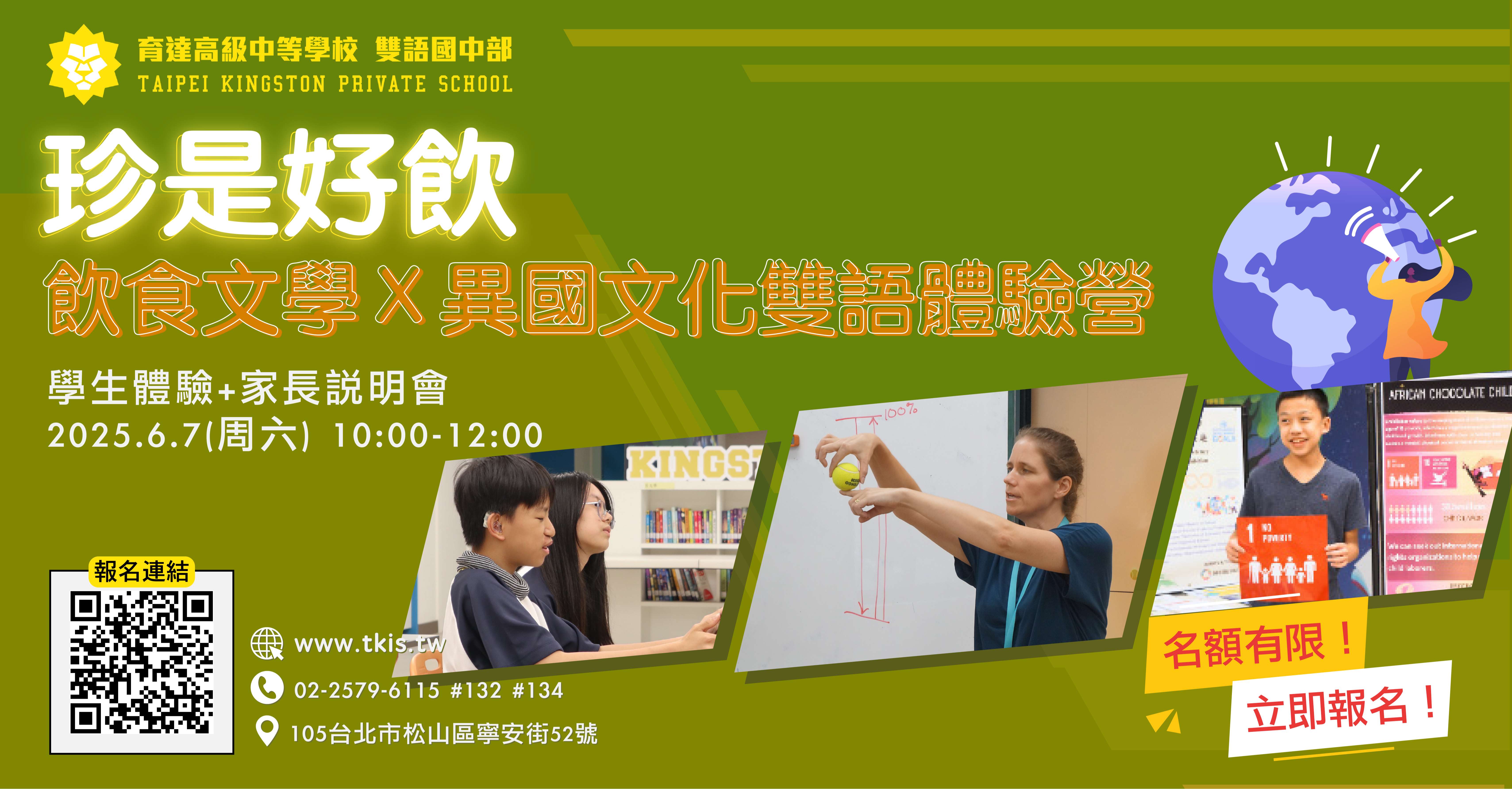 一、課程介紹:在全球化的時代,雙語能力是孩子未來發展的重要資產,本次Kingston雙語體驗營集結本校外師與中師, 設計一系列豐富有趣的體驗課程,讓學生能在半日時光中以地球永續的概念,品嚐美味飲品同時寫出優美的飲食文 學,外師分享異國飲食文化,打開國際觀!我們也在同一時間安排入學說明會,深入介紹我們的課程規劃與環境導覽,歡迎爸爸媽媽帶著您的孩子一同報名參加!