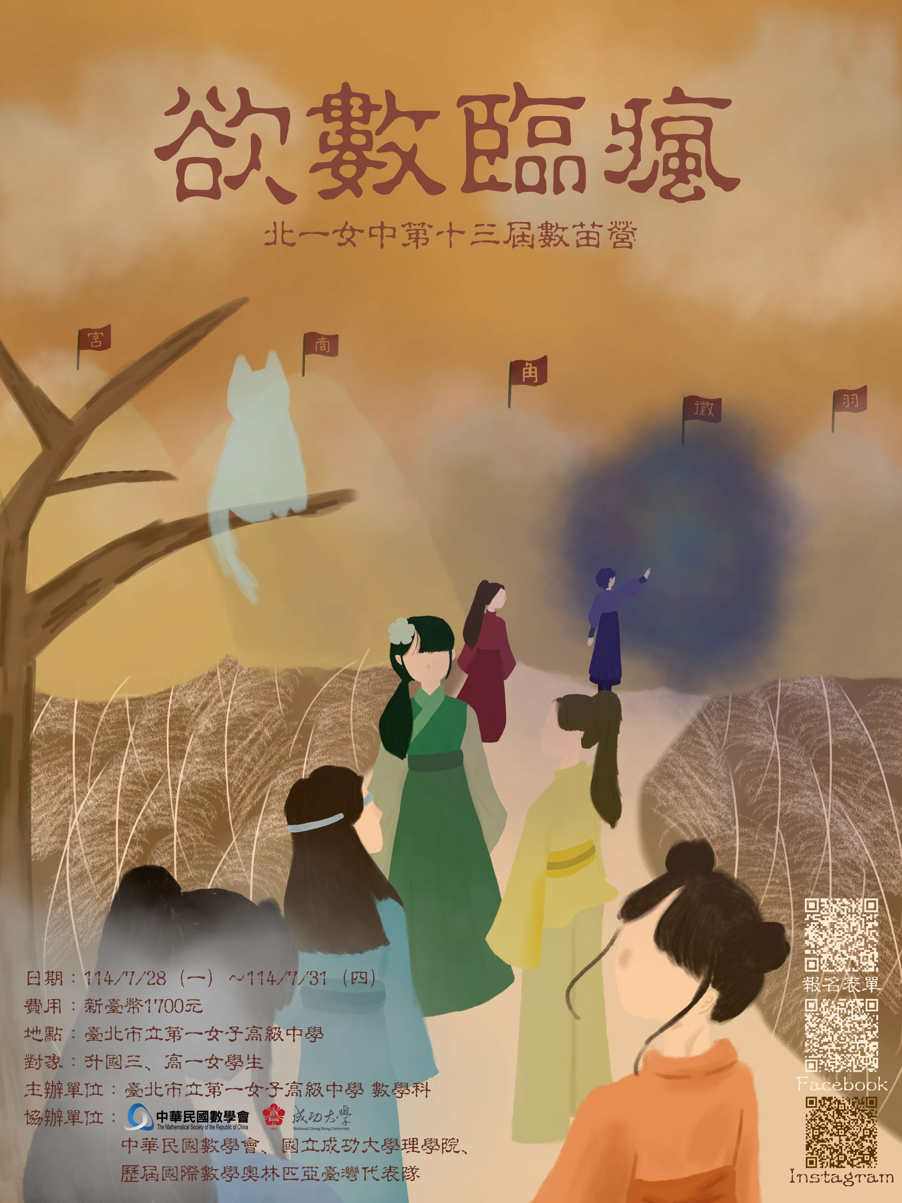 一、本活動之目的係針對喜好數學或對數學有興趣的女學生設 計一系列課程及活動,使其學習及欣賞初等數學、認識數 學競賽,並從中找到數學之美。藉由與教授、數學教師及 具數學競賽或研究經驗的學長姐對談,增進學生的數學成 熟度;同時透過學生之間的討論、切磋,訓練其解題思維 與技巧,並彼此交流認識,以此培育國家未來的優秀女性 數學人才。 二、旨揭活動舉辦日期為114年7月28日(一)至7月31日(四),共 四日。地點為北一女中校園、參加人員為升國三及升高一 女學生,預計招收40名學員。 三、報名時間:即日起至114年7月6日(日)止。 四、旨揭活動招生海報如附件。五、活動詳情及報名資訊,請至Facebook粉絲專頁「北一女中 數苗營」(www.facebook.com/tfgmathcamp)或Instagram: tfgmathcamp查詢。 六、聯絡方式:除以上社群帳號外,本活動聯絡信箱為 tfgmathcamp@gmail.com,若有任何活動相關問題,歡迎來 信詢問。
