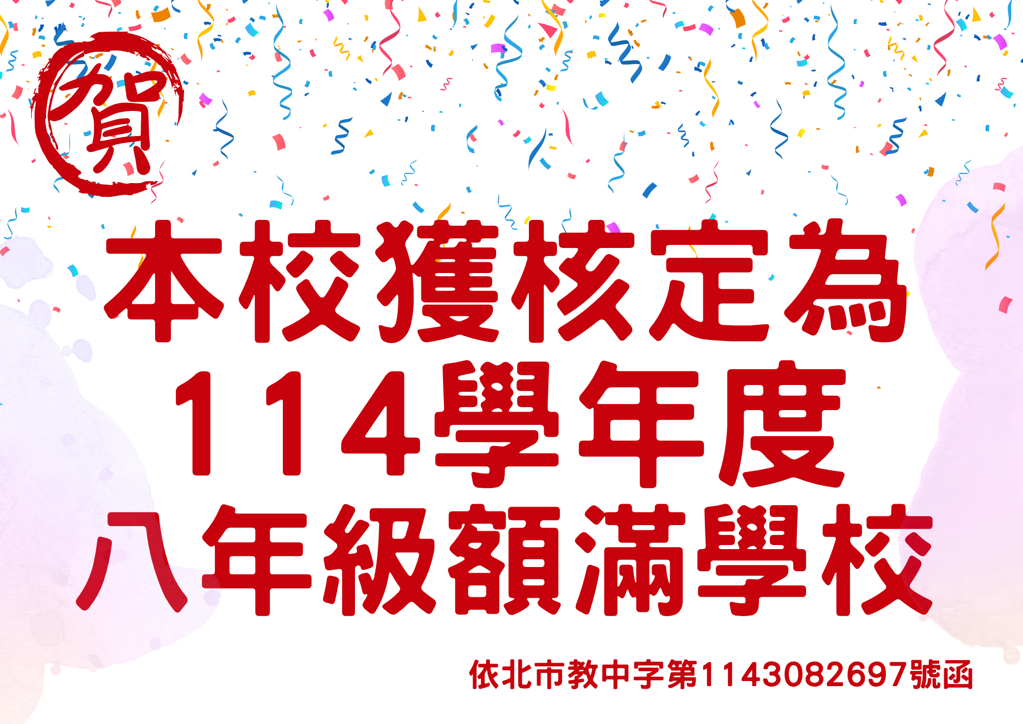 依北市教中字第1143082697號函,本校獲教育局核定為114學年度八年級額滿學校,改分發學校為重慶國中,倘有轉入生,依規定協助辦理改分發事宜。