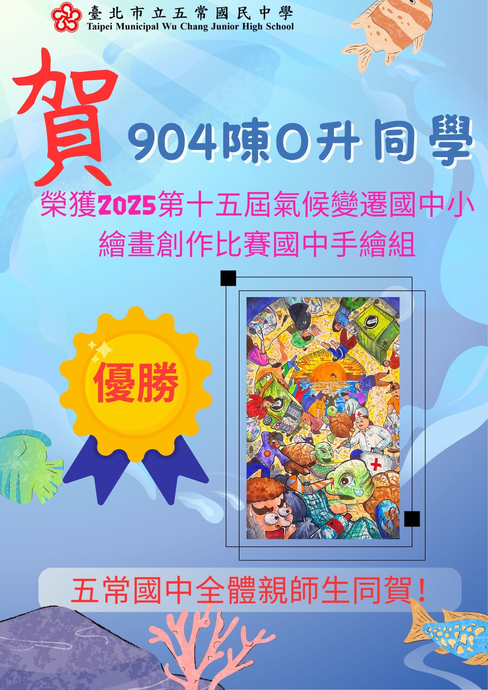 恭喜904陳O升同學榮獲「2025第15屆氣候變遷國中小繪畫創作比賽」【優勝】!!五常國中全體親師生同賀!!