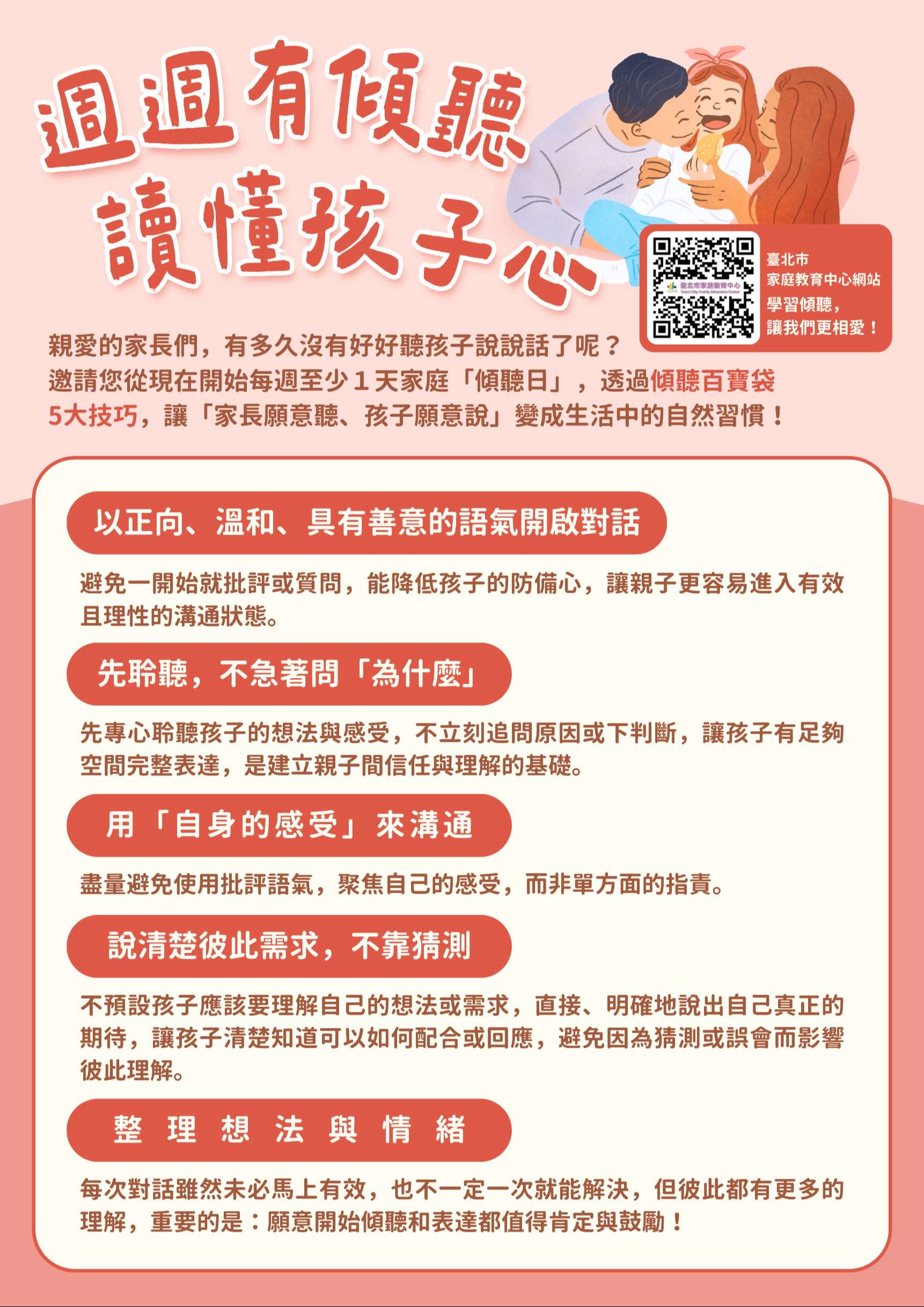 一、為打造「家長願意聽,孩子願意說」的環境,鼓勵所有家 長每週至少撥出一天為家庭「傾聽日」,暫時放下手邊的 忙碌,專心聽孩子內心的聲音,透過「傾聽百寶袋」5大技 巧,協助家長有效實踐傾聽,促進親子間雙向溝通與情感 交流。