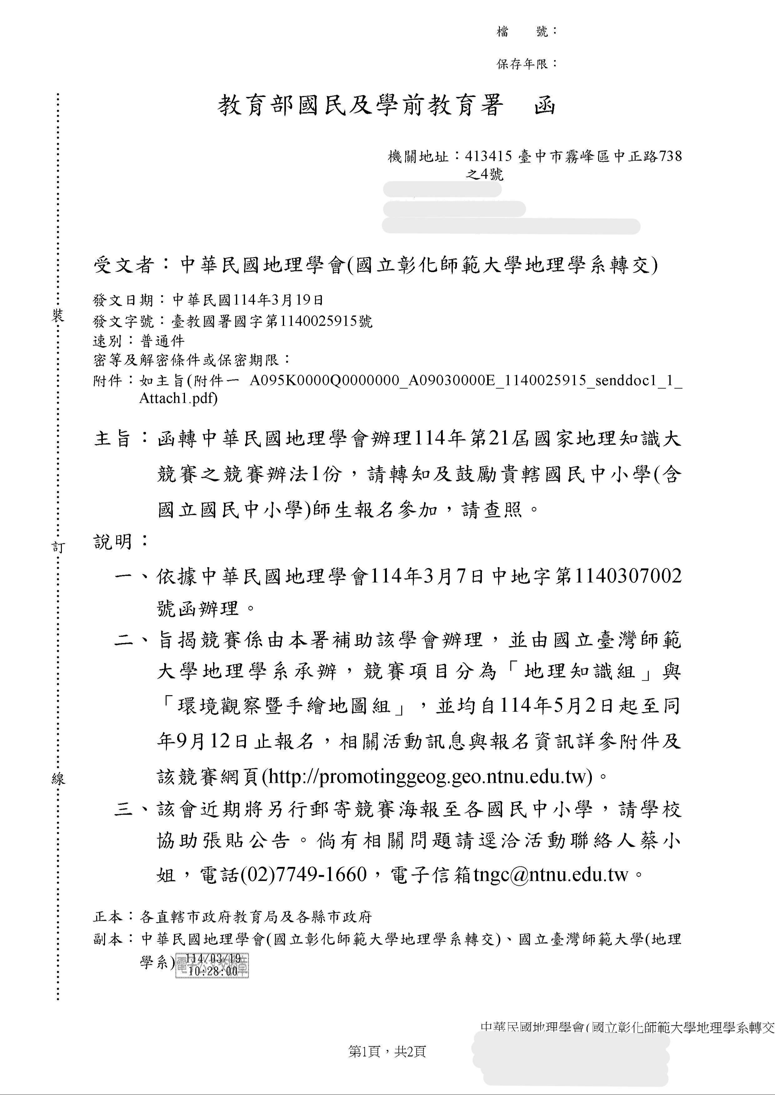 一、依據教育部國民及學前教育署114年3月19日臺教國署國字