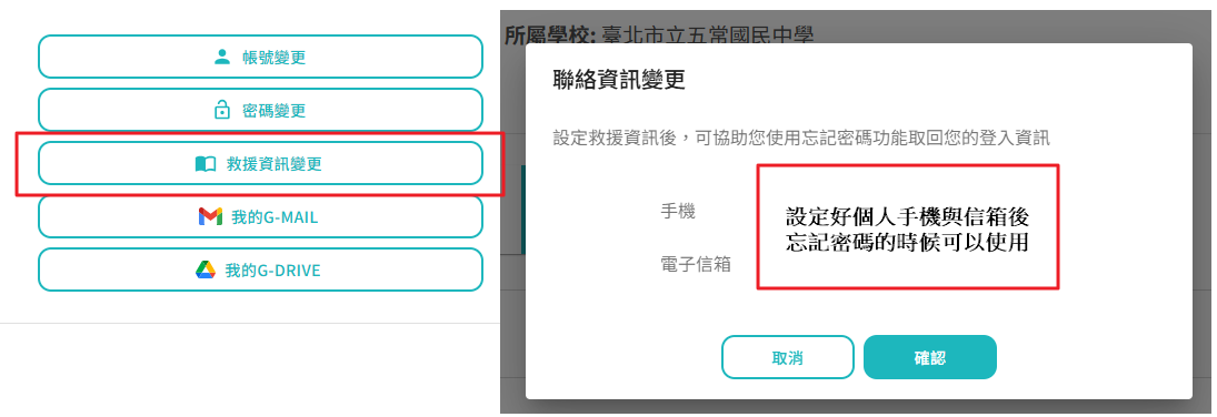 國中學生首次登入須強制變更密碼,並請設定密碼救援資訊,以利日後自行重設。