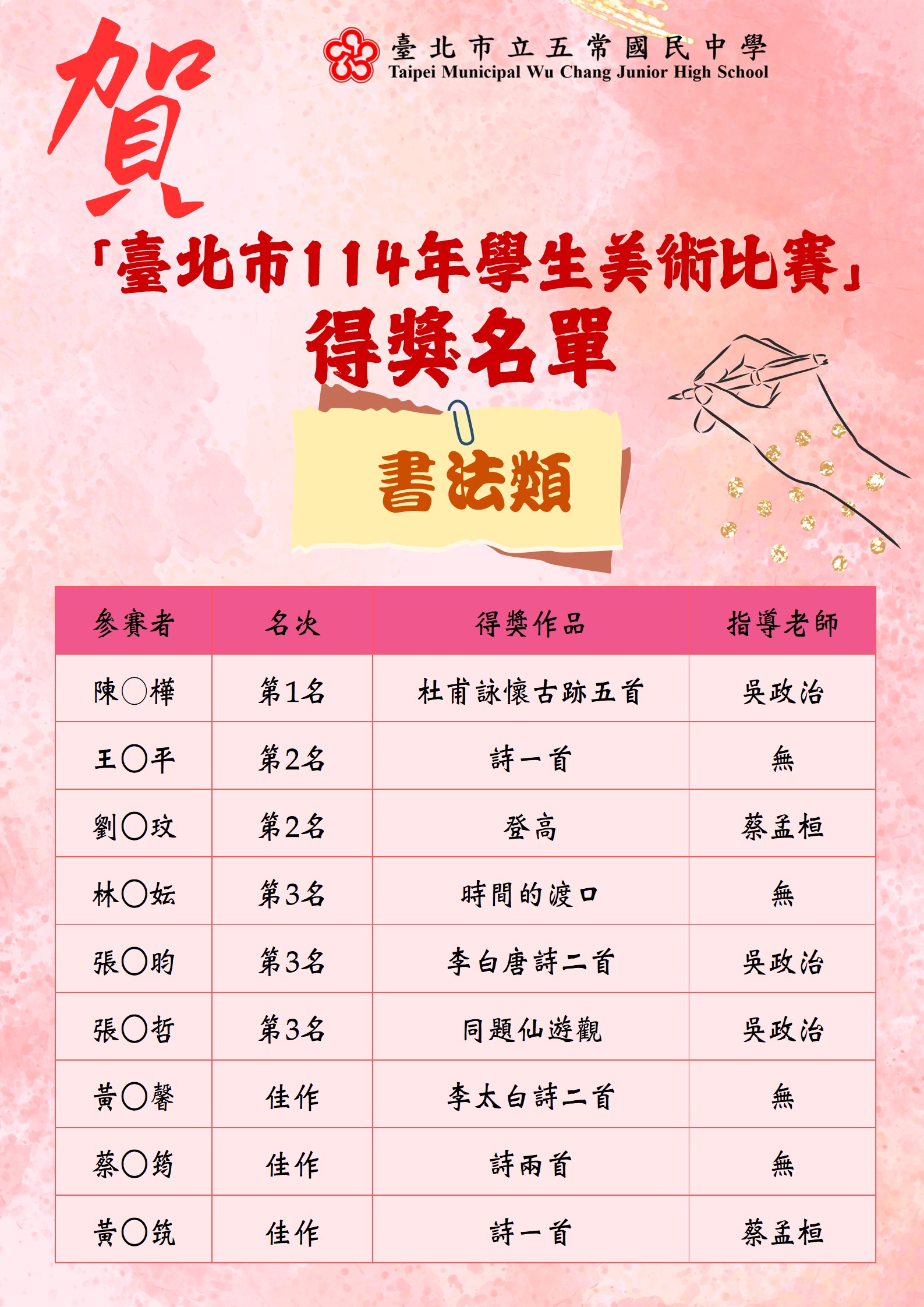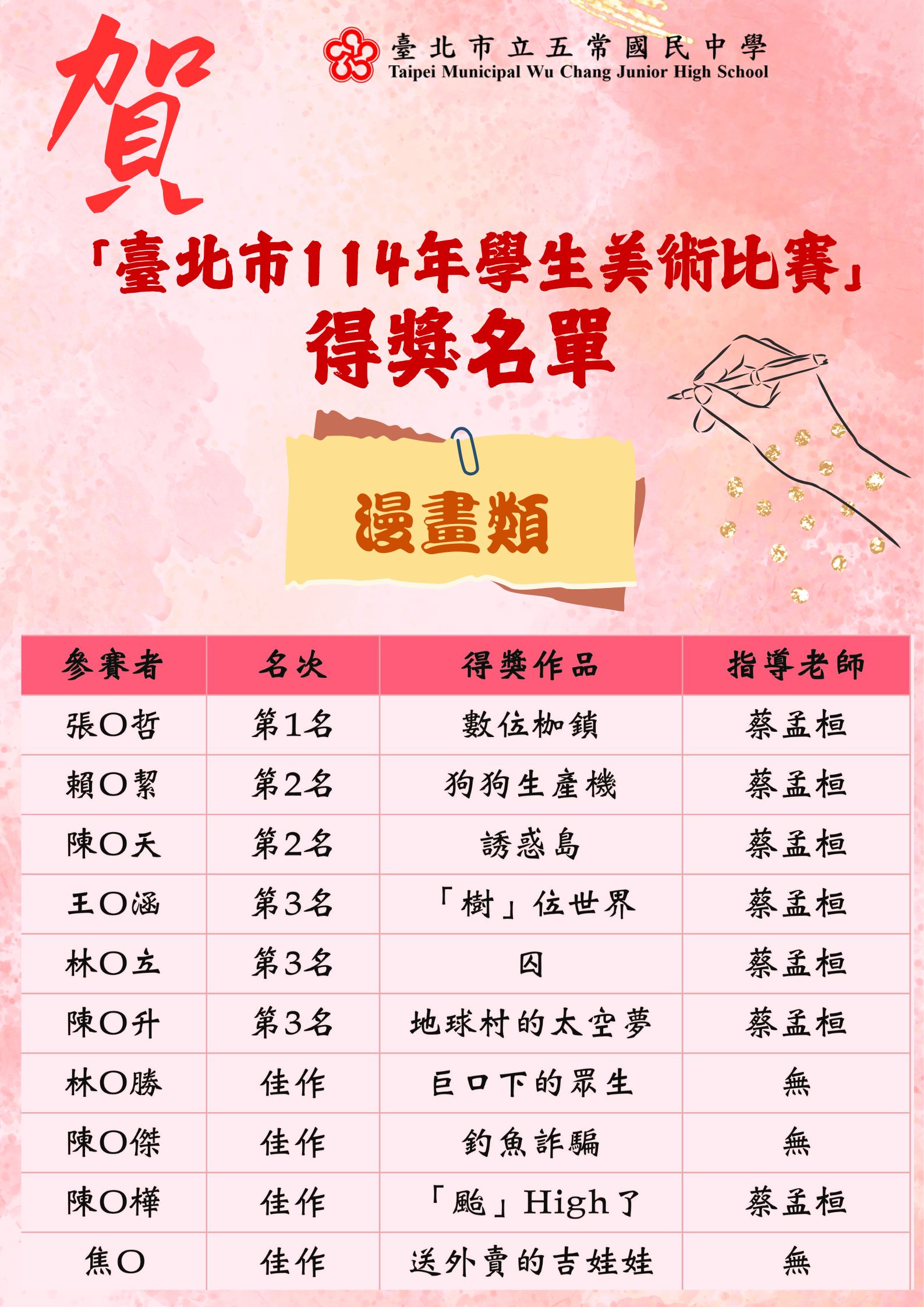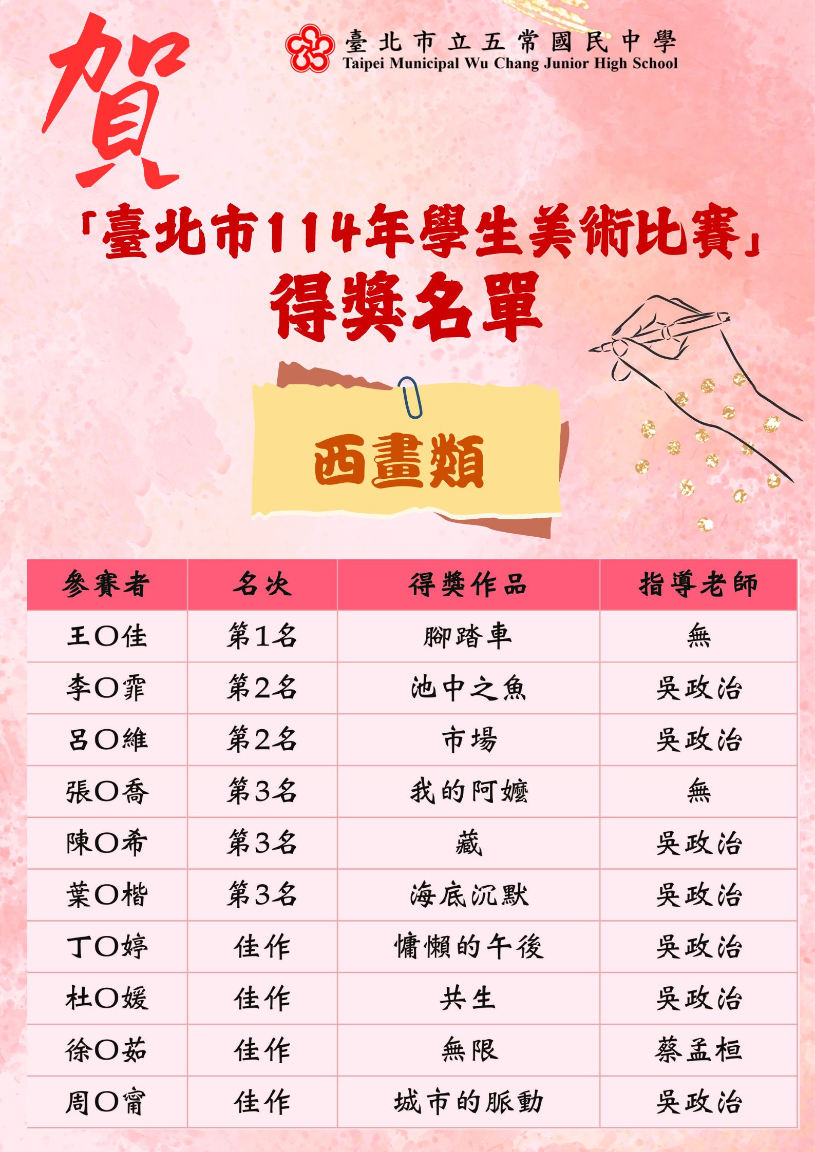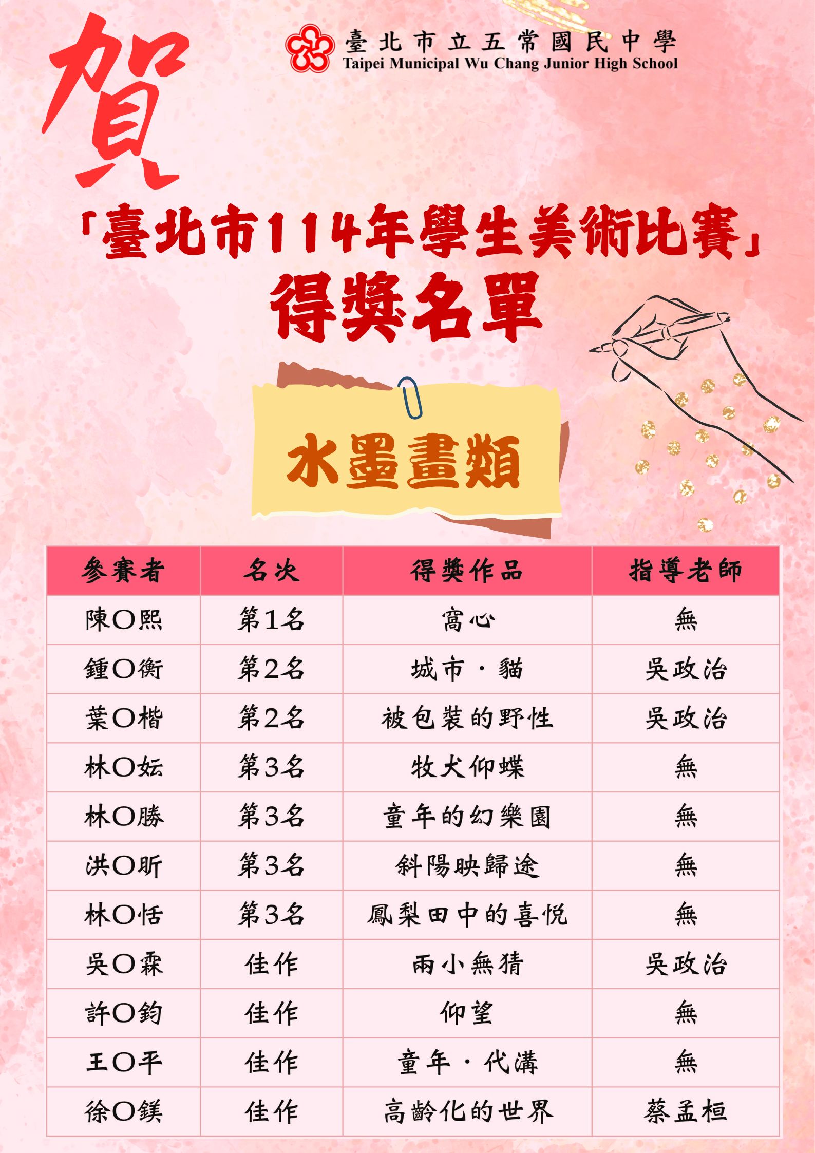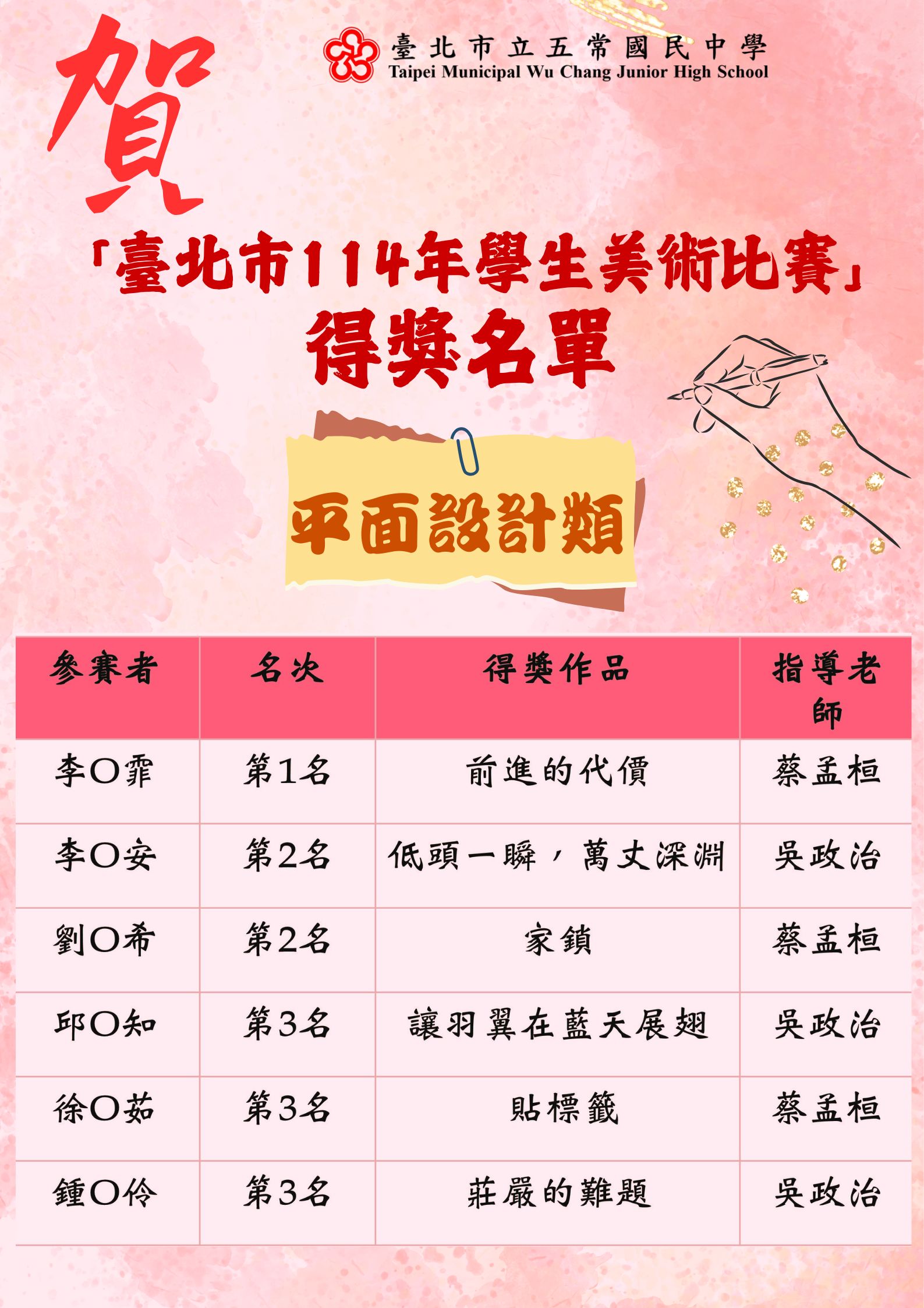 本校參加臺北市114學年度學生美術比賽得獎名單