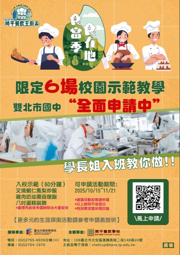 一、為推廣餐飲教育與實作體驗,開平餐飲學校辦理「第27屆主廚盃」系列活動,規劃限定6場校園示範教學,邀請雙北市國中學生一同進入廚藝實作的現場,透過專業師生的親身示範與帶領,體驗餐飲的魅力與技藝。