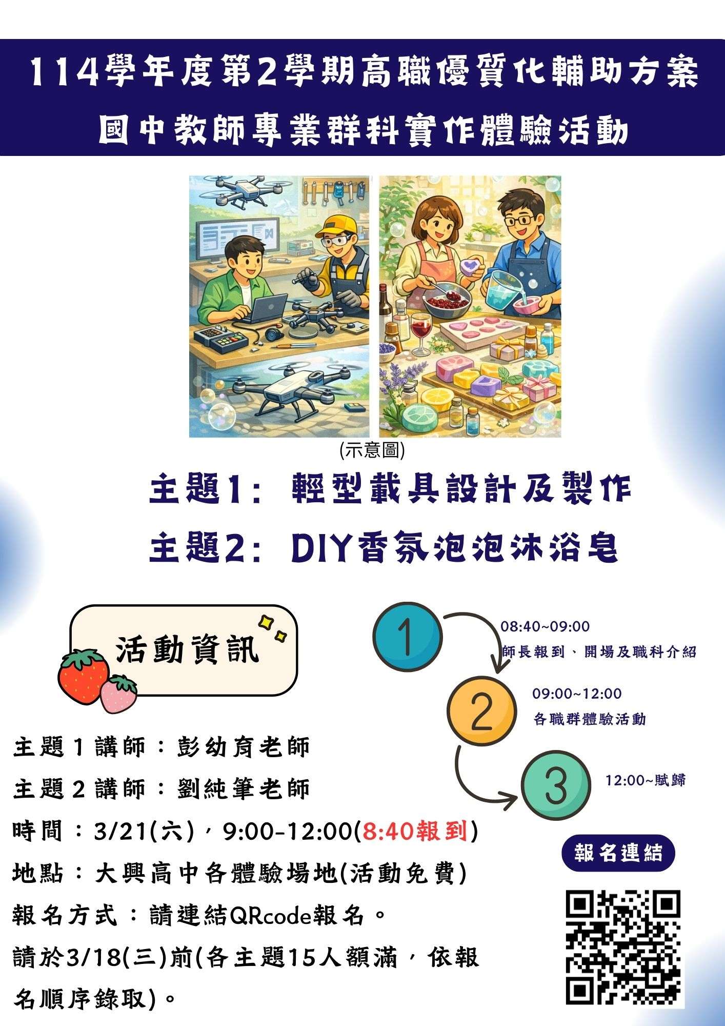 七、活動內容:動力機械群-主題:輕型載具設計及製作。家政群-主題:DIY香氛泡泡沐浴皂。